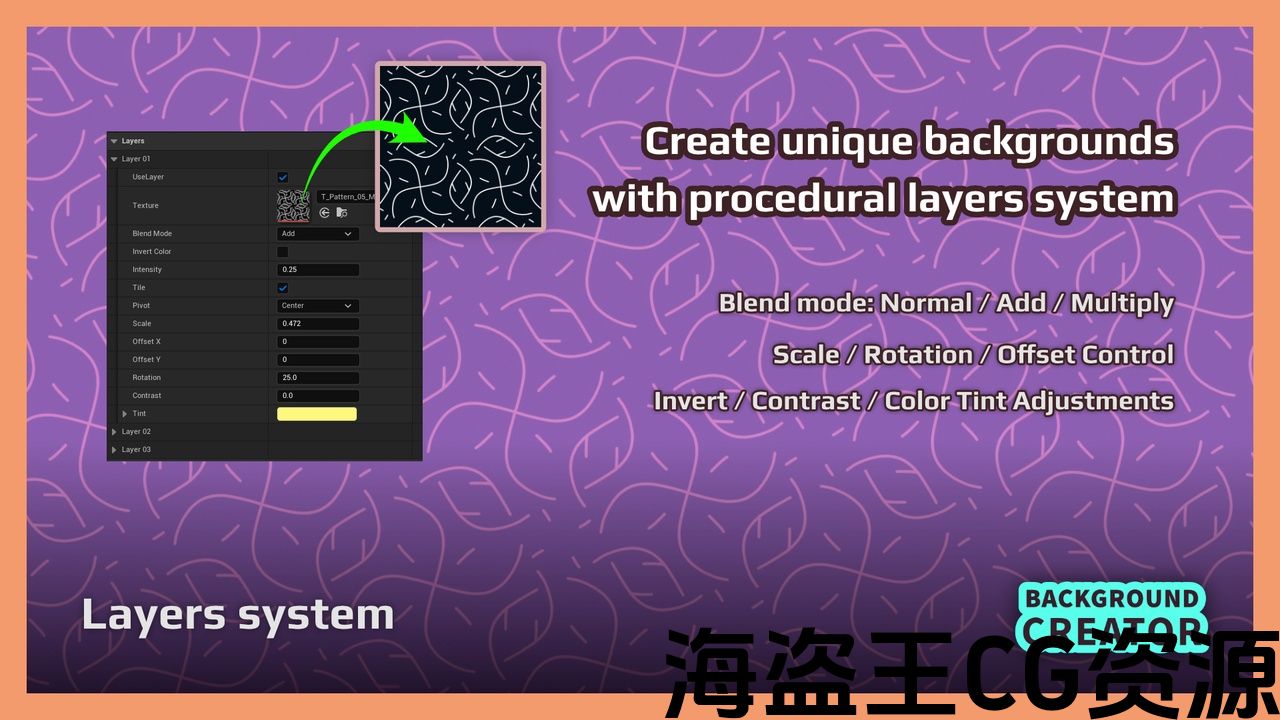 使用易于使用的蓝图,使用后处理材质创建完全程序化的分层背景。 包含模式蒙版的拖放模板。更新:-1.0.1:添加了简单的图层动画,添加了资产指南,以告知用户有关自定义深度设置