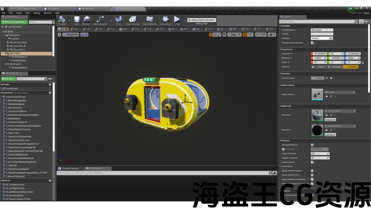 - 一个出租车蓝图,典当类,它可以在地图上传输角色,带有声音、动画引擎、门,并使用静态网格体制作,可以很容易地替换