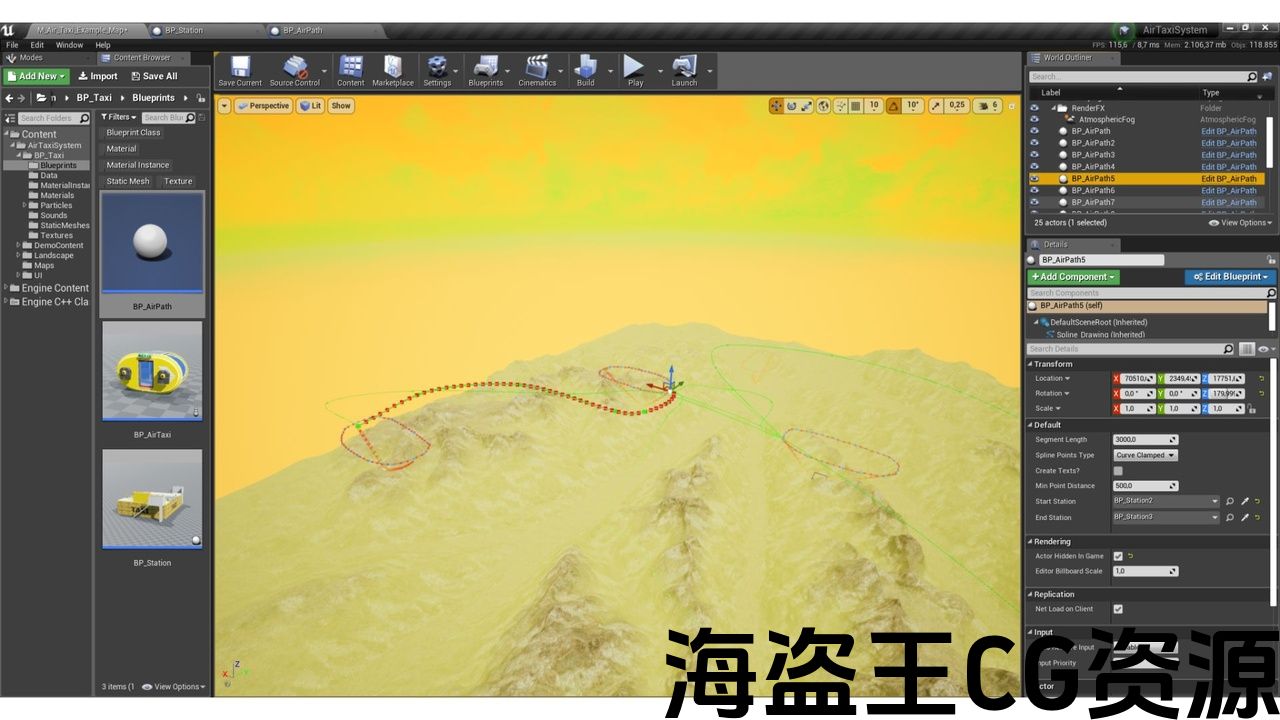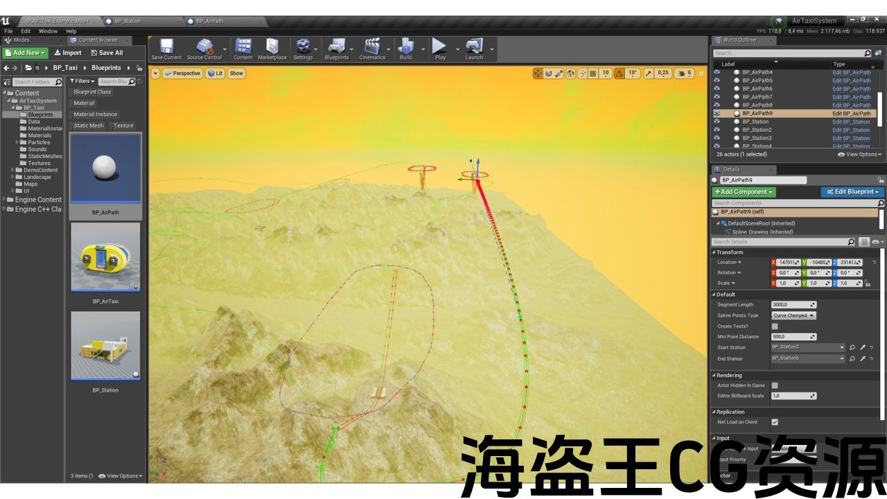 - 3 blueprints (STATION + TAXI + AIRPATH) + 2 demo blueprints for the overview scene and character