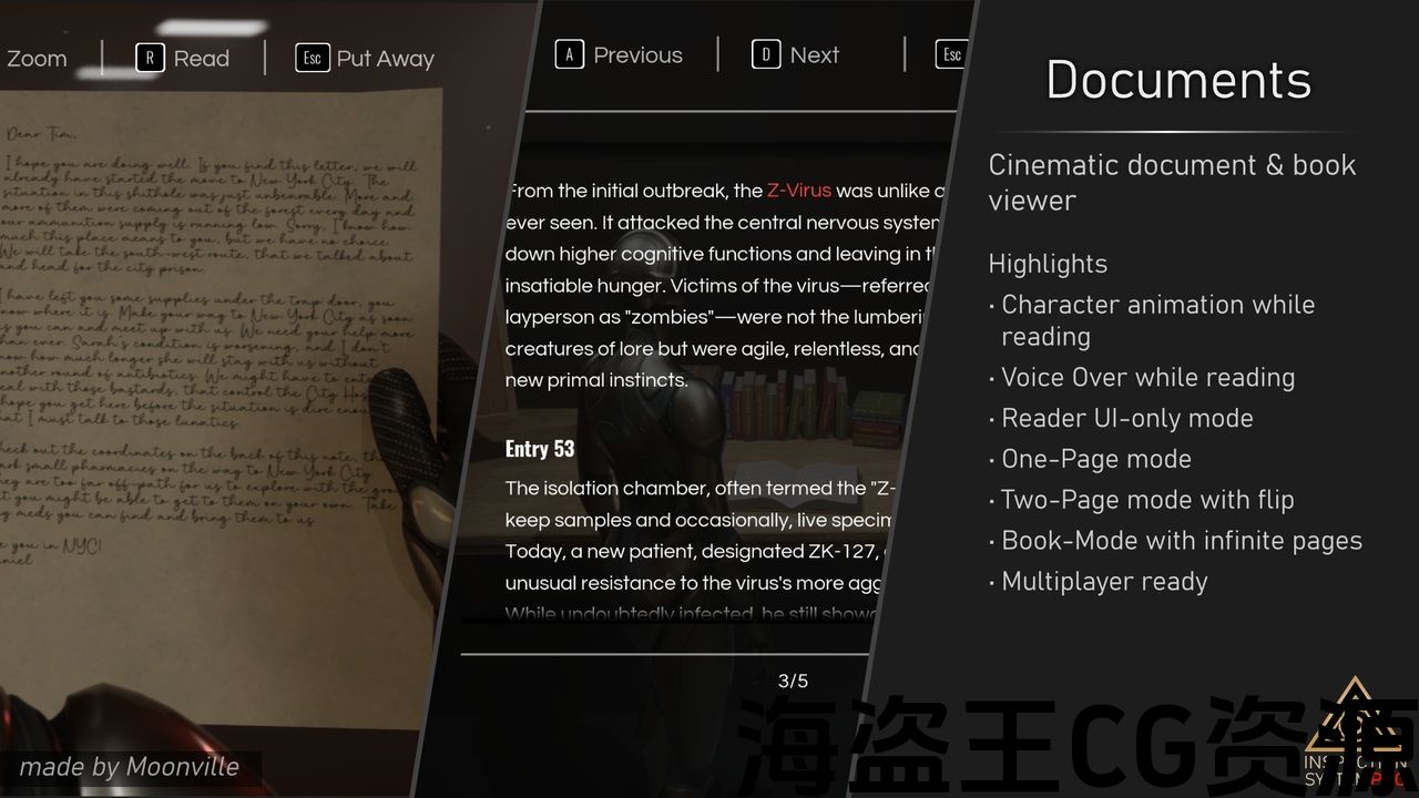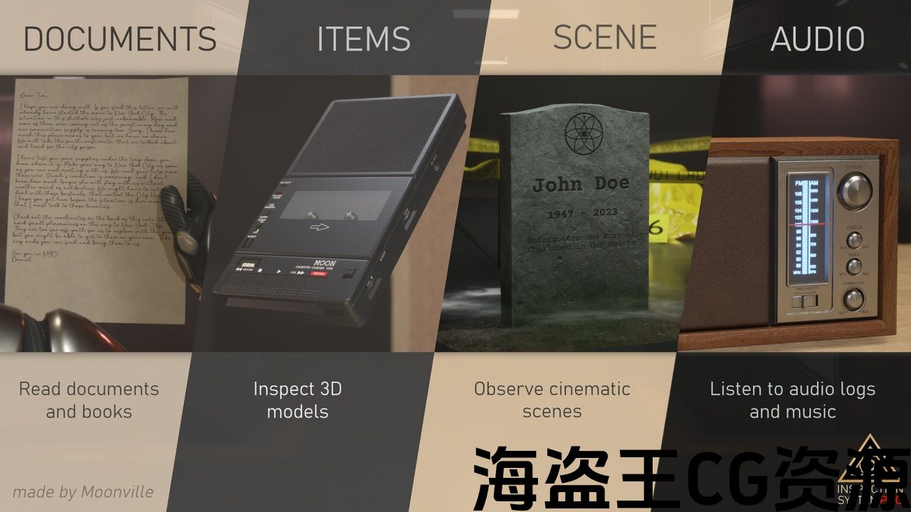 Inspection System Pro will take the storytelling of your game to the next level. Inspections are a key component for environmental storytelling as seen in many AAA games. Read documents and books, inspect 3D models, observe cinematic scenes and listen to audio logs and music. Revisit explored inspections anytime, anywhere in the Discovery Menu.
