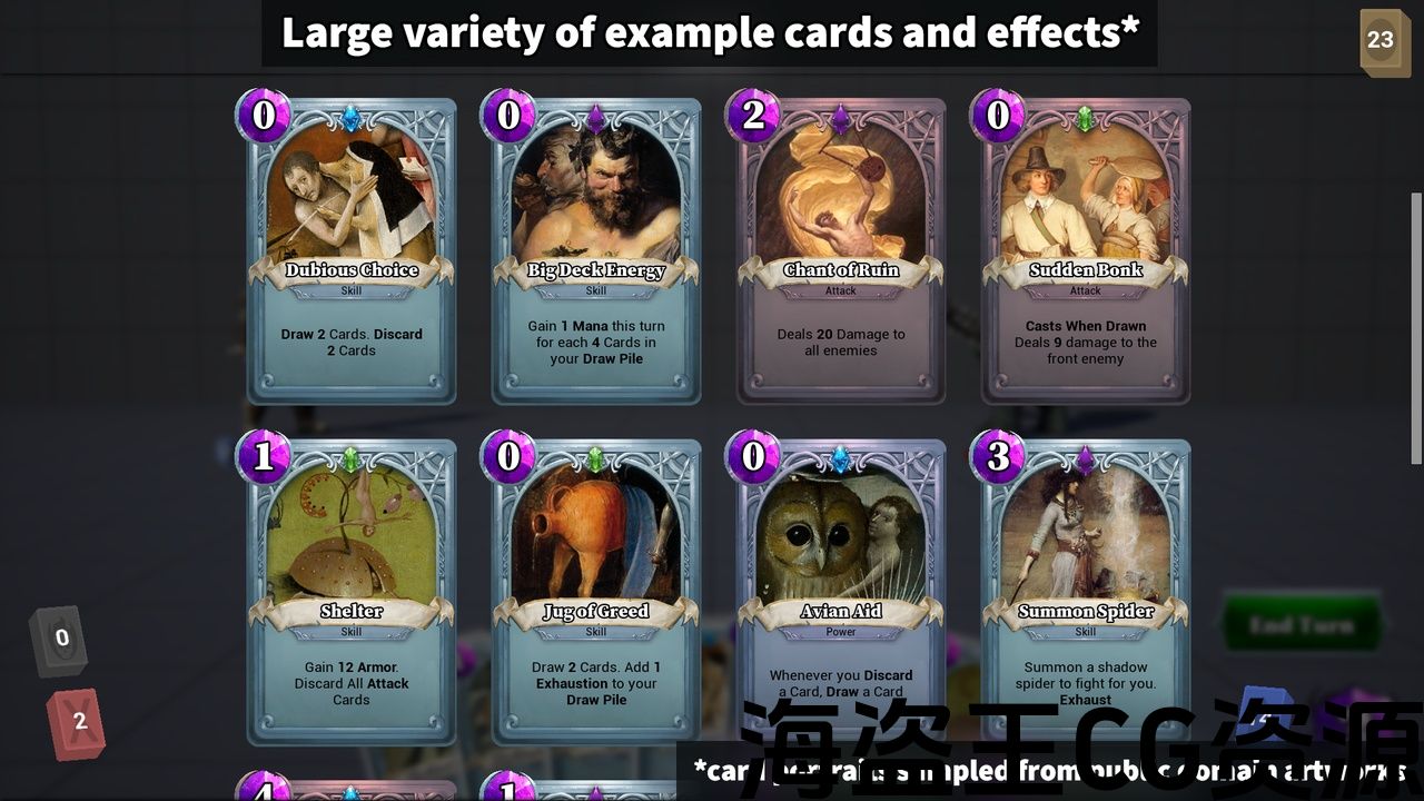 此资源包含创建完整roguelike deckbuilder纸牌游戏所需的所有组件。 该工具包受到该类型经典的启发,提供了一个灵活和模块化的框架,用于创建复杂和互动的游戏规则。
