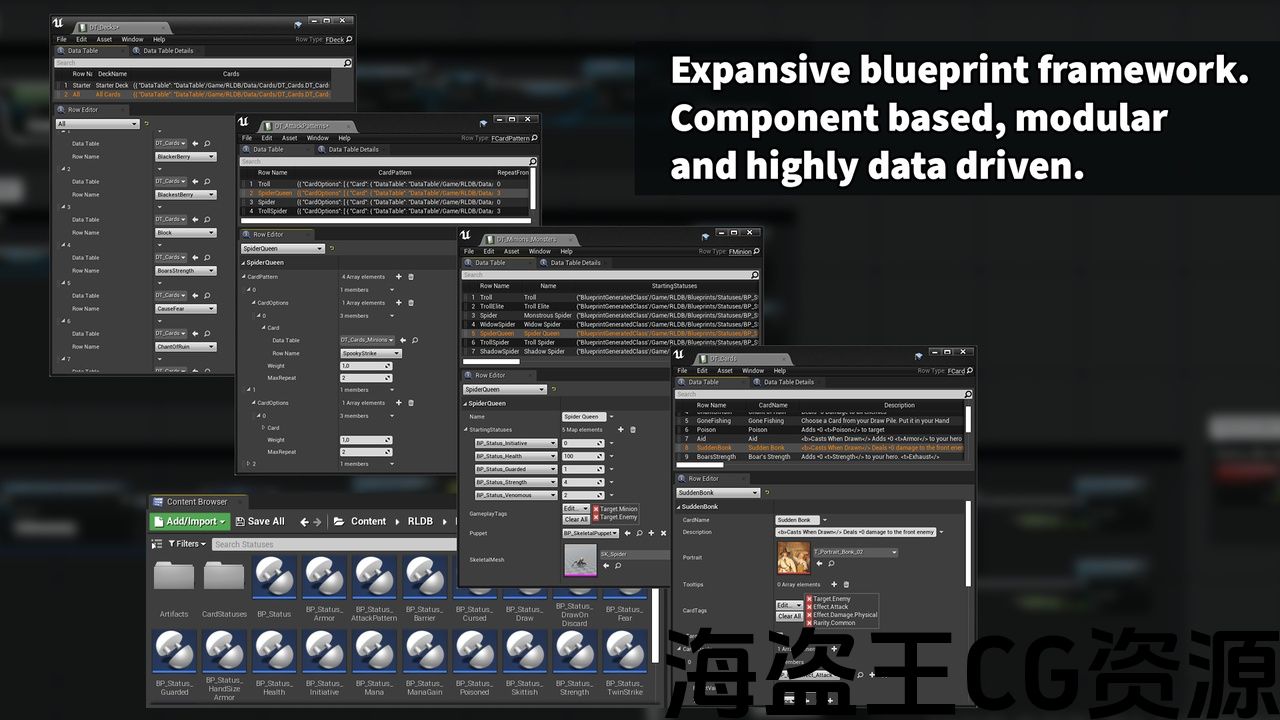 该资产是数据驱动的,主要基于组件,让您可以轻松地通过数据表添加新的卡片、爪牙和工件,并通过组件定义它们的行为。