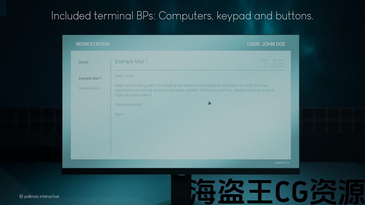 Besides the core interaction functionality, complex example use-cases in form of ready to use blueprint classes are also included. These blueprint classes cover computer terminals, which can be used to access predefined mail and to control connected systems, keypads for switching system states as well as simple switch buttons. A controllable system can be any other actor that’s using an integrated system component.