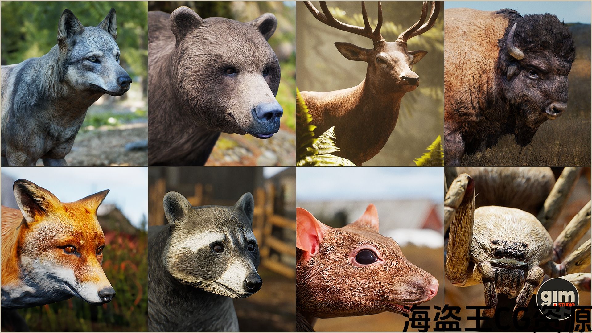 逼真的灰狼,棕熊,马鹿,美洲野牛,狐狸,浣熊,老鼠和蜘蛛与动画创作在60fps,4k纹理,2k纹理(狐狸,浣熊,老鼠,蜘蛛)和骨网格(狼,熊,鹿,野牛)。