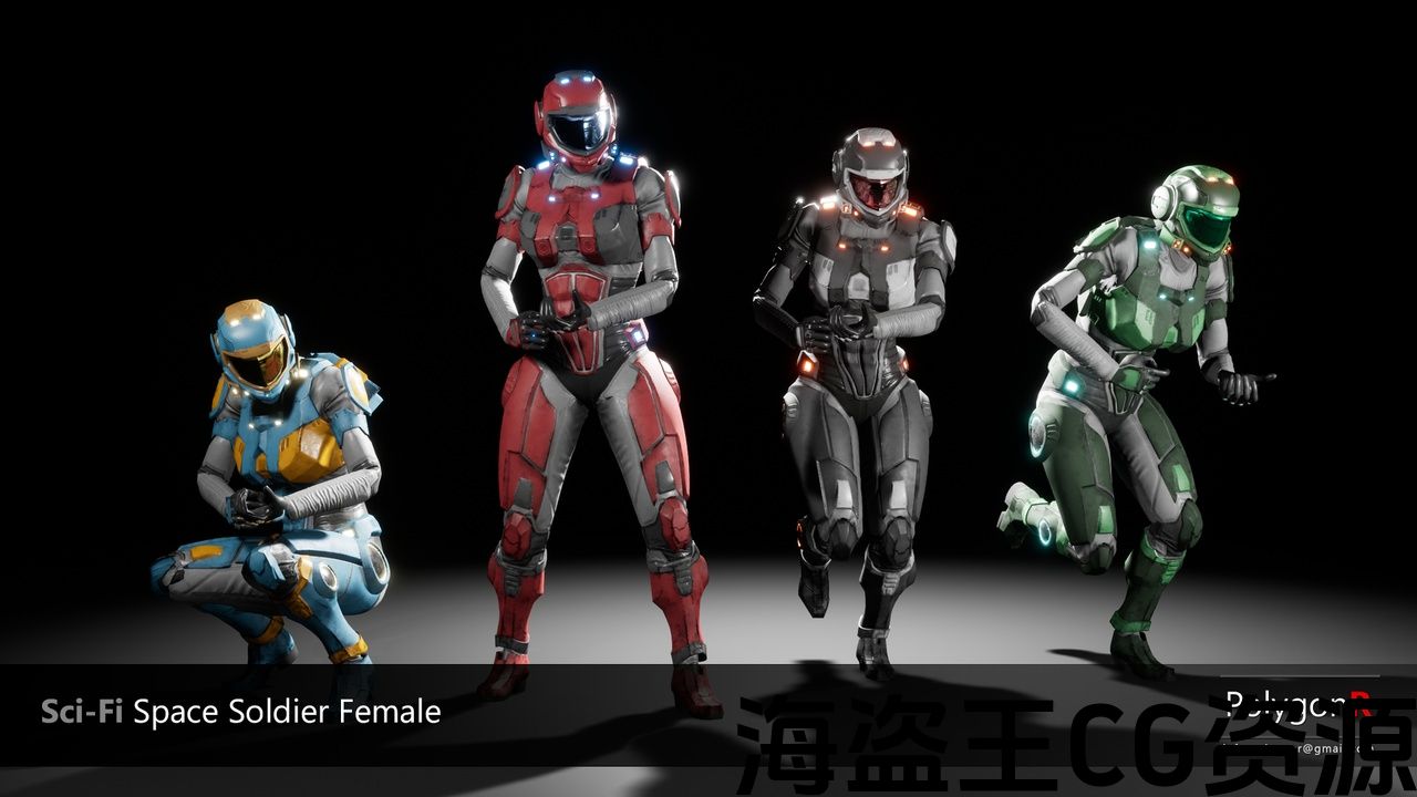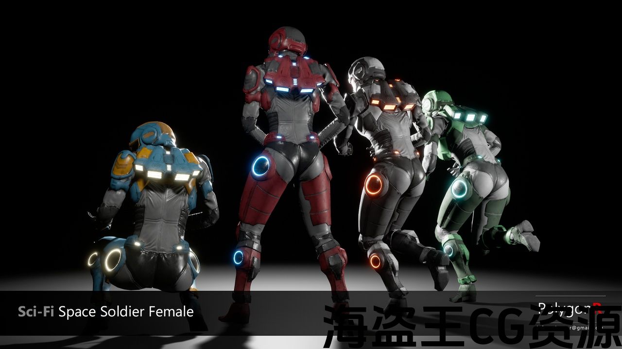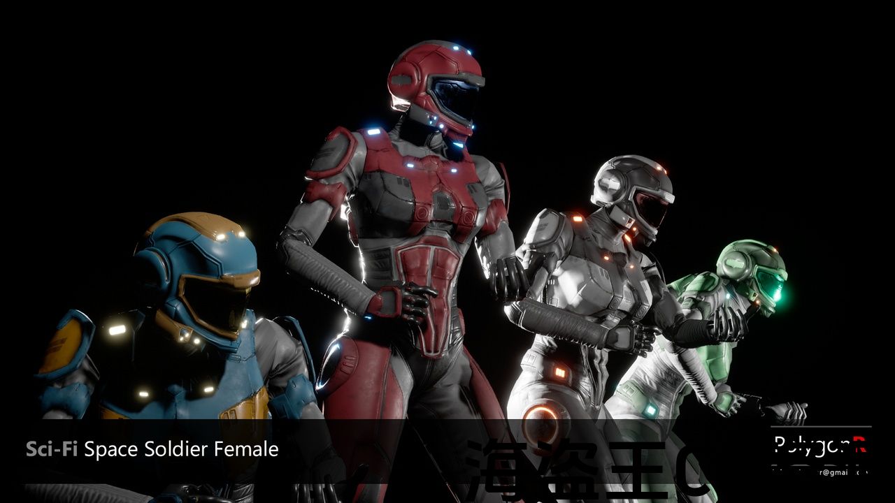 科幻太空士兵女性完全操纵使用史诗骨架,测试使用免费动画包。 材质有3种可自定义的颜色可供选择,外加1种颜色可用于自发光蒙版
