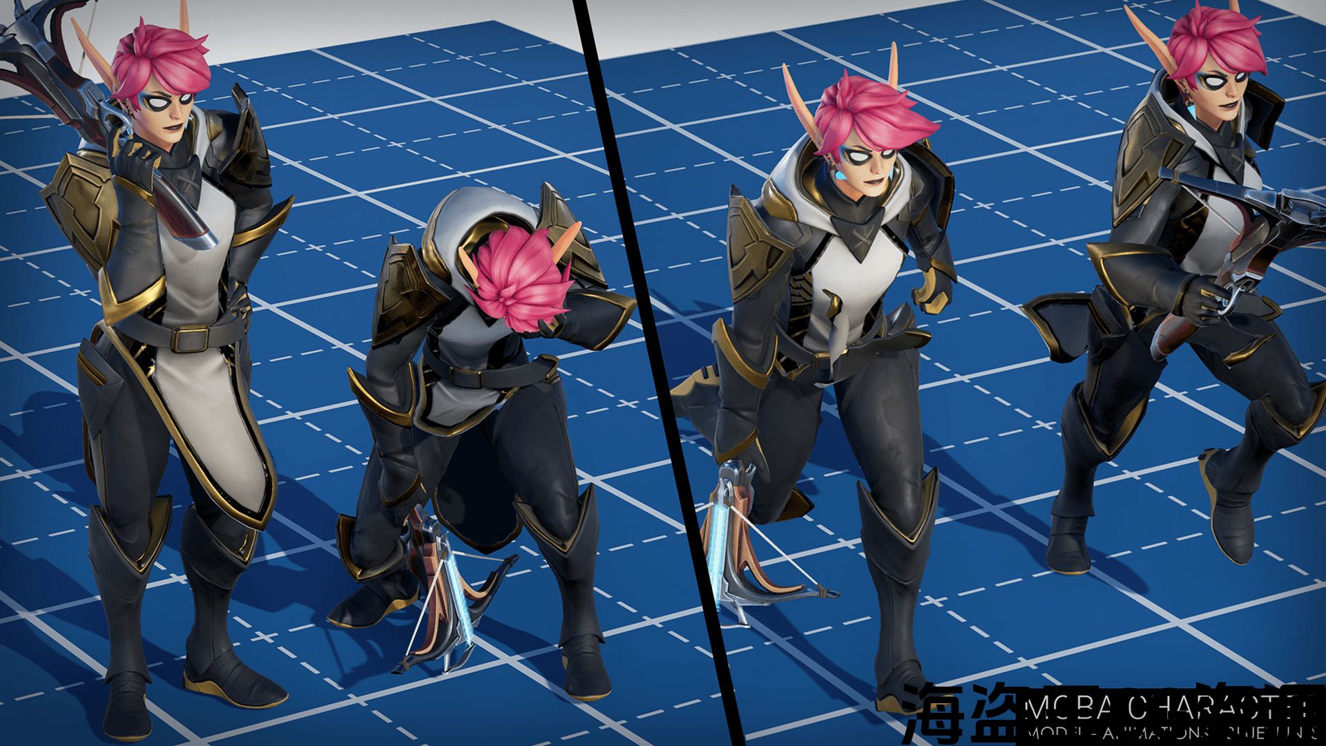 动画:动作空闲,动作空闲(备用),攻击,攻击(备用),运行,运行(备用),角色选择空闲,死亡,眩晕,跌倒,嘲讽,终极能力。
