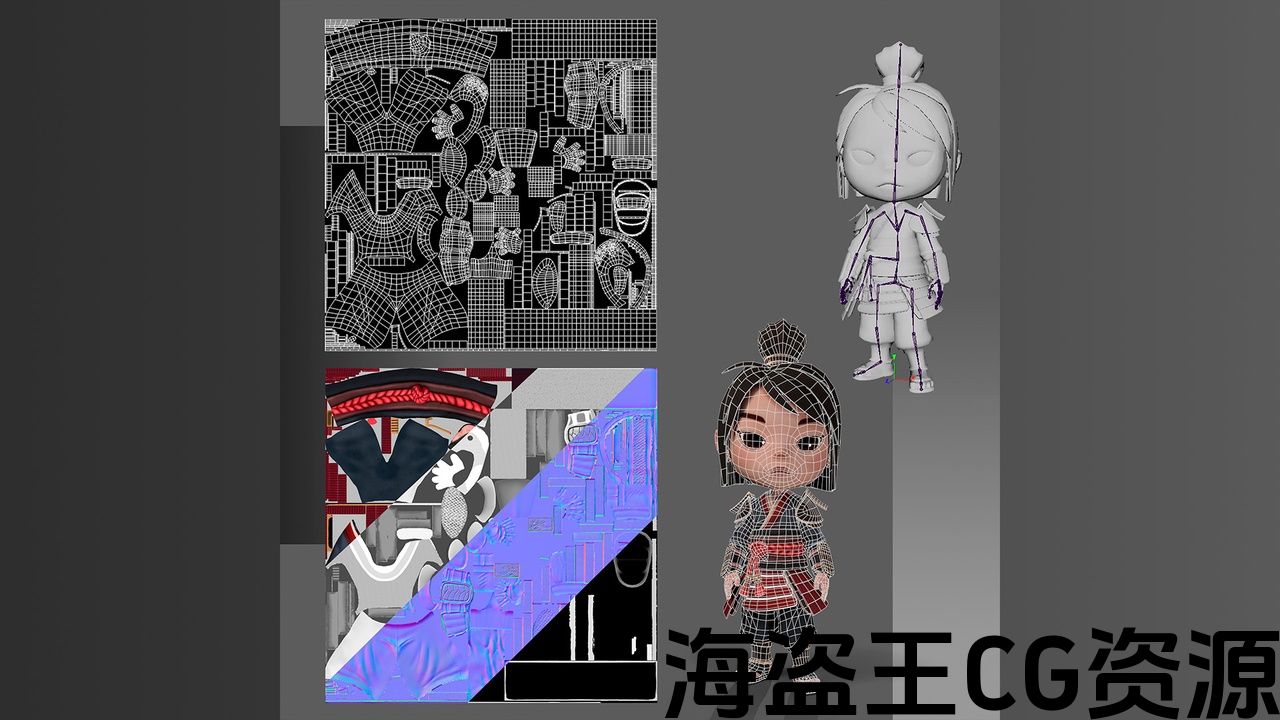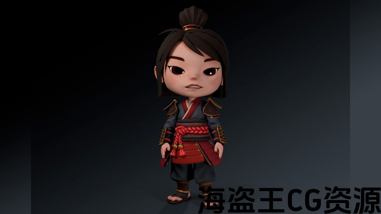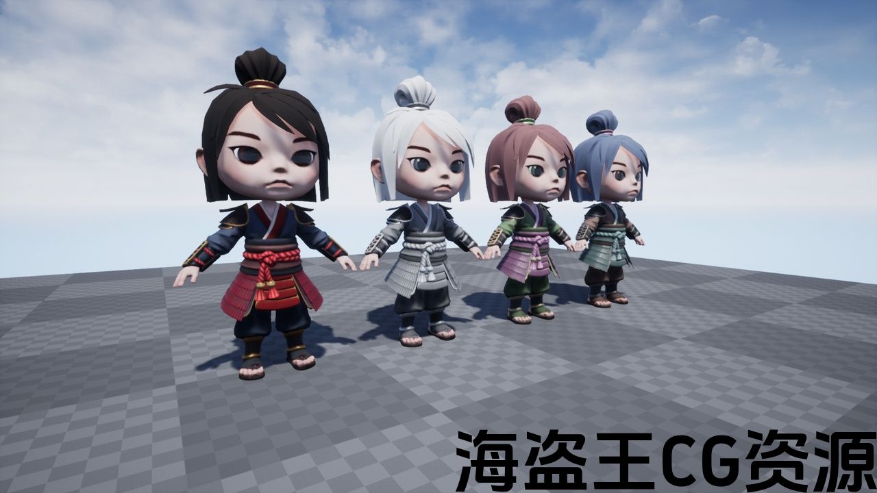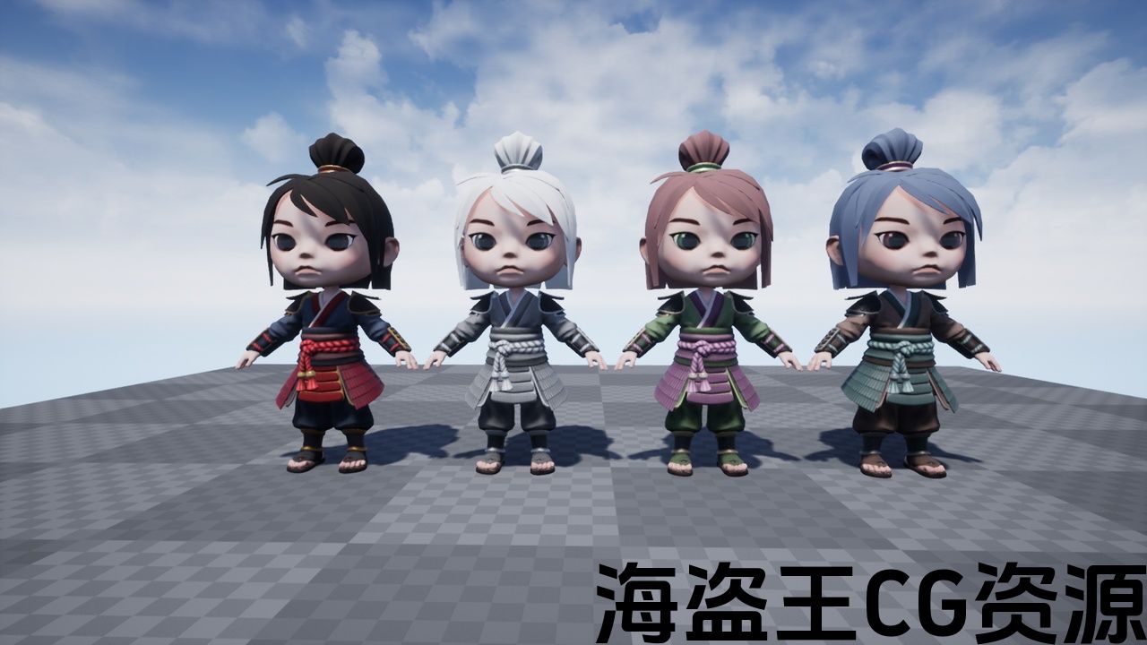 Chibi Samurai has default-colored armor, hair and eye material set, and fully adjustable material set (please use material instances).