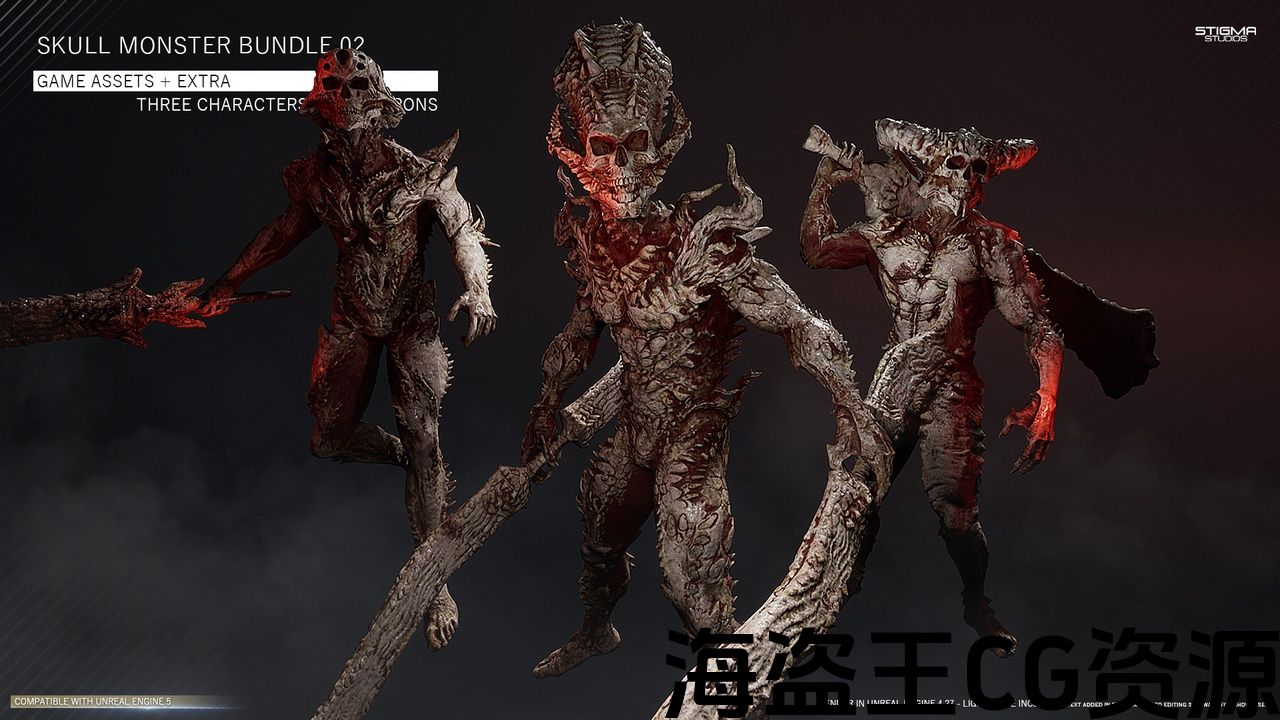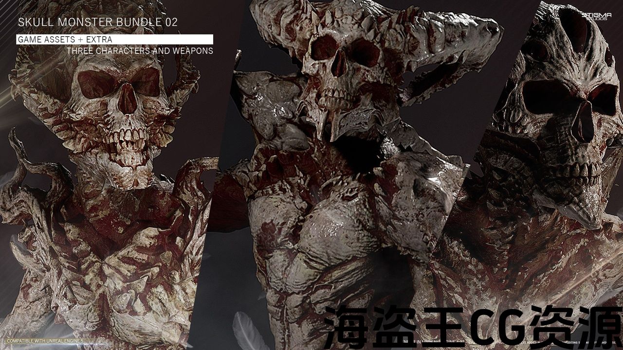 Three Skull monster characters with weapon set for your game, designed to be versatile for the Modern, Futuristic or Medieval Horror/Action game!