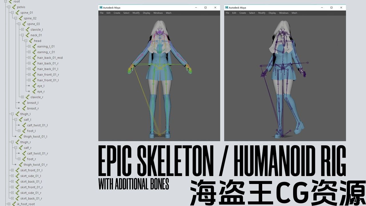 This Character rig is based on UE4 Mannequin skeleton. The main bones hierarchy is remained untouched for easy retargeting. With additional bones you can apply physics to different parts. The rig is made in Maya without plugins and does not have controls. Additional bones that are added to Epic Skeleton: eye_l/r, breast_l/r, hair_back_01_l/r, hair_front_01-03_l/r, hair_back_01-03_mid, earring_r/l, perf_belt_01, perf_skirt_01-05_01-04, casual_skirt_back/side/front_01-03_l/r, casual_skirt_fix_bone_front/back_01-02