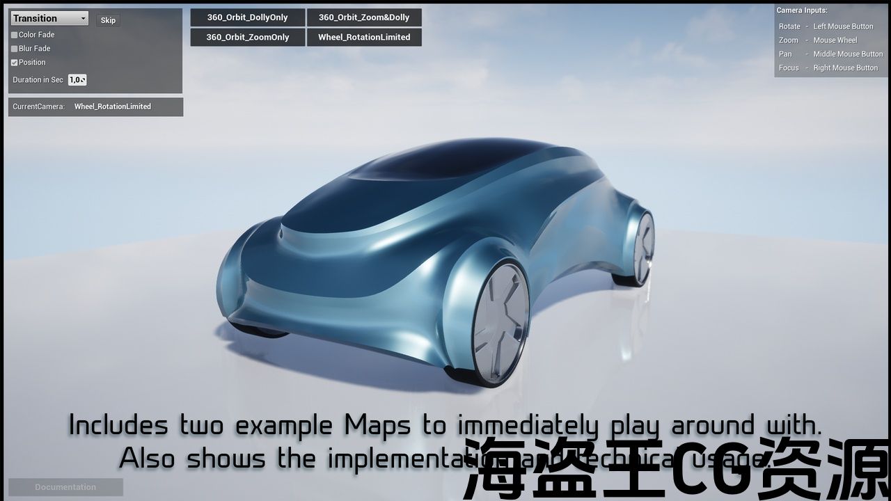 The Manager then lets you switch between these Cameras with various different Options like: Black Fade, Blur Viewport or a nice Transition Rotating and moving. All these options can be customized via Curves. It also enables you to control a selected Camera (Rotate, Zoom, Set new Focus, Pan,…) with custom Inputs.