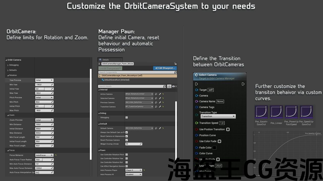 - It can Transition between Orbit Cameras (Color Fade, Blur, Position) which can combined and configured as you wish (Color, strength, Transition Time / Speed , Custom Transition Curve, …)