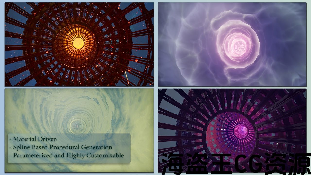 Procedural Vortex Tunnel是一个插件,可让您通过预定义的参数集以程序方式沿着给定样条路径构建可自定义的Vortex Tunnel。