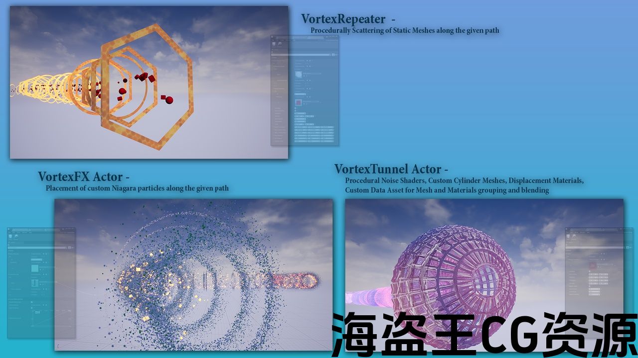 - VortexRepeater Actor沿vortex路径以程序方式散射一组静态网格体。 自定义Repeater数据包含控制网格如何分散的参数。