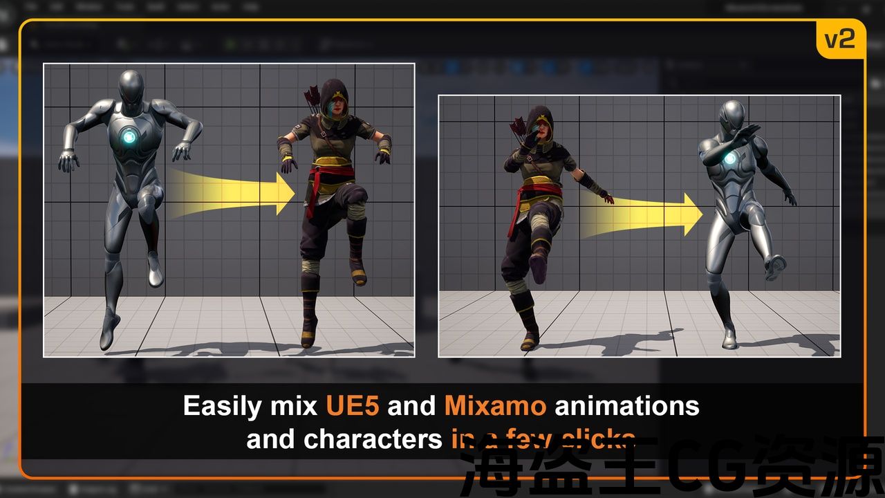只需点击几下,它就可以让您将任何Mixamo动画与任何UE5角色一起使用,并将任何UE5动画与任何Mixamo角色一起使用。 此外,它还可以在Mixamo角色上使用根运动动画,并从Mixamo创建根运动动画 就地安置 动画。