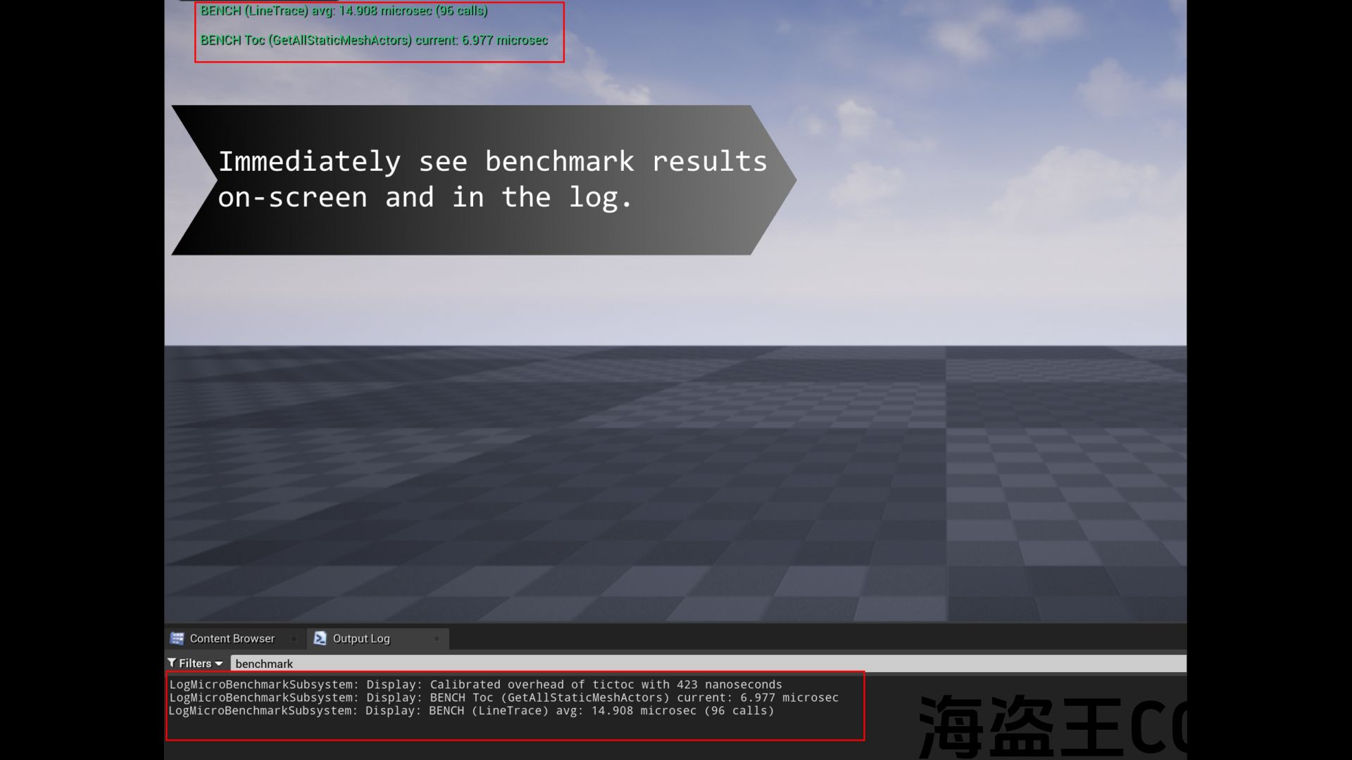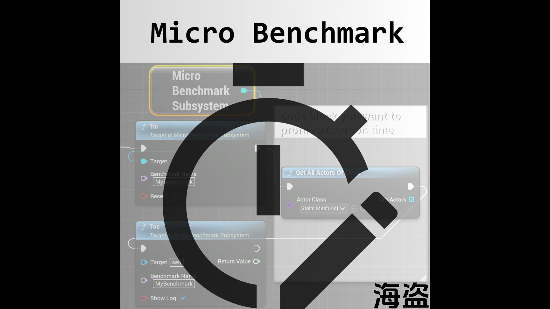 With MicroBenchmark, call Tic (in Blueprints or C++) before the block in question and Toc directly after. You instantly get a timing profile of the execution time with nanosecond accuracy. Optimize your code by comparing different implementations, find out if native C++ code is faster compared to pure Blueprints, identify bottlenecks and get a better understanding of your code’s performance.