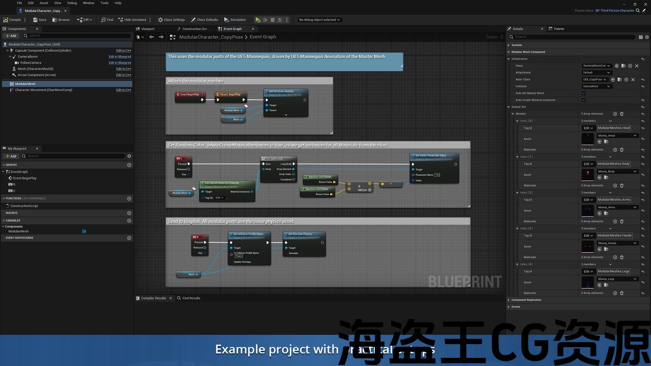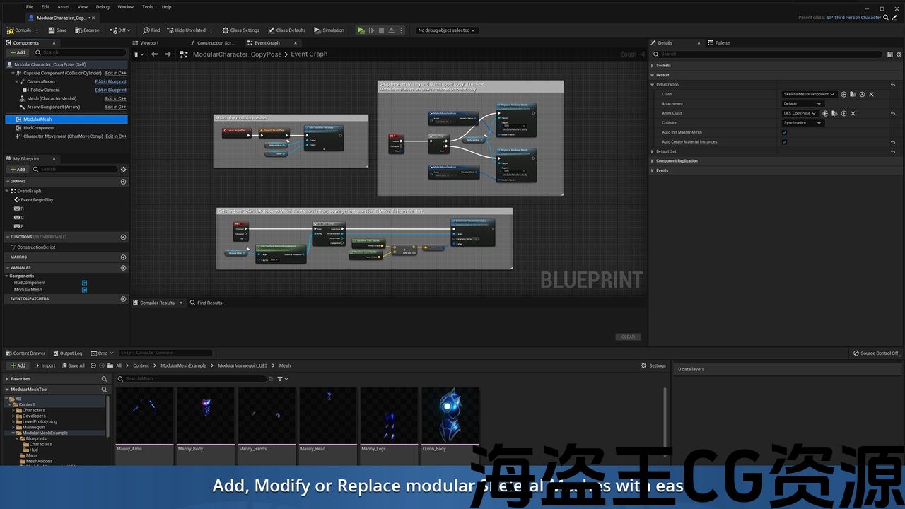 这就是模块化网格工具包将帮助您的项目,并大大加快使用这些模块化部件的过程。 该系统非常灵活,不限于一个特定的情况。 它可以用于可定制的角色,也可以用于模块化武器等。 它具有许多非常简单的蓝图节点,可以轻松集成到新项目和现有项目中。