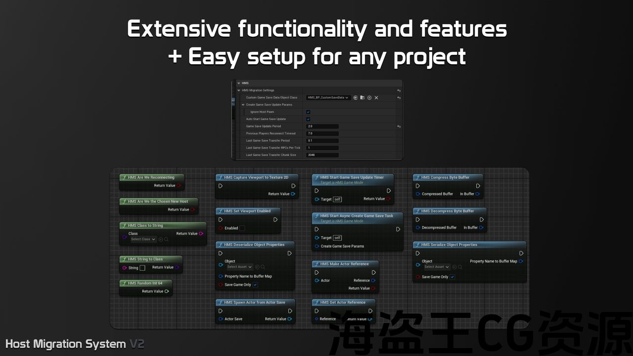 Host Migration System V2 lets your sessions continue even if the Host disconnects, by transfering the entire game state to a new host chosen among the clients, and re-hosting the game in a mere instant – check out how fast it is in the Showcase Video