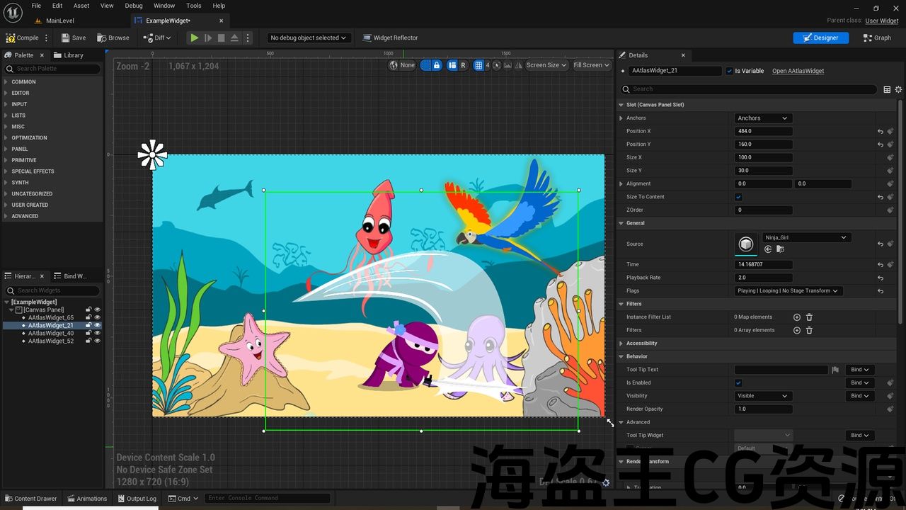 添加一个新的小部件添加到UMG场景称为’AAtlasWidget’,您可以在此小部件中设置导入的源动画,默认情况下它将在导出对象的舞台位置绘制,如果您希望独立设置对象,则可以在小部件上设置’NoStageTransform’标志,它将忽略舞台变换。 对象边界考虑动画的整个对象的生命周期,因此从帧到帧的基础上,它可能比任何单个帧大得多。