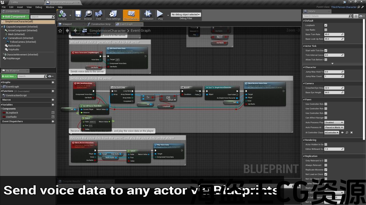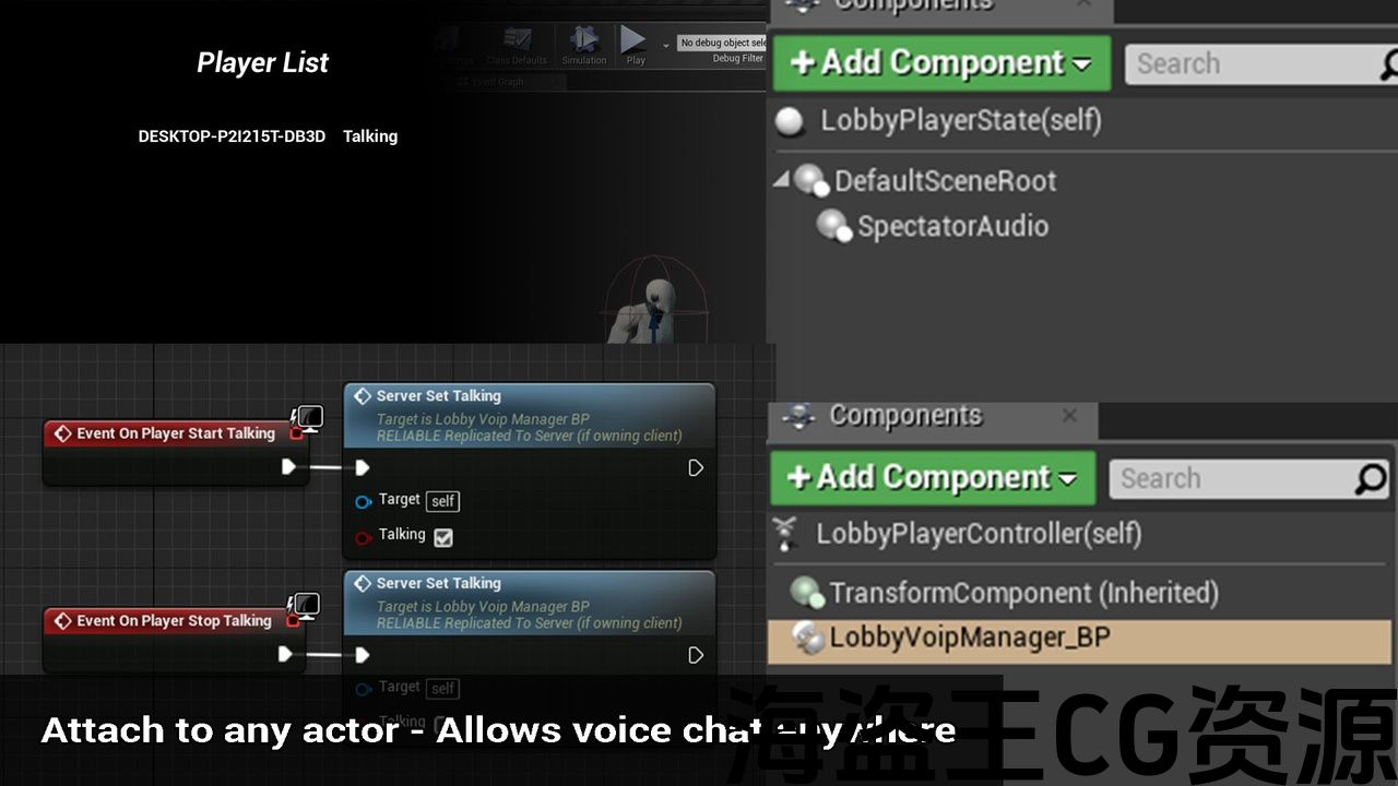 Voip Manager组件捕获音频,然后通过事件将其传递给蓝图,以便您可以选择如何发送和播放音频。 然后,Voip音频组件播放压缩音频。 这两个组件都可以连接到任何actor,这意味着您不仅可以在游戏中使用音频,还可以在大厅或观看时使用音频等。 该系统旨在为您提供尽可能多的灵活性。