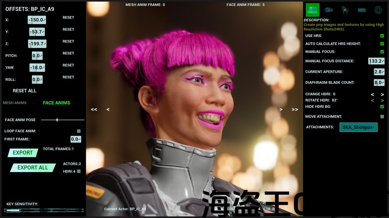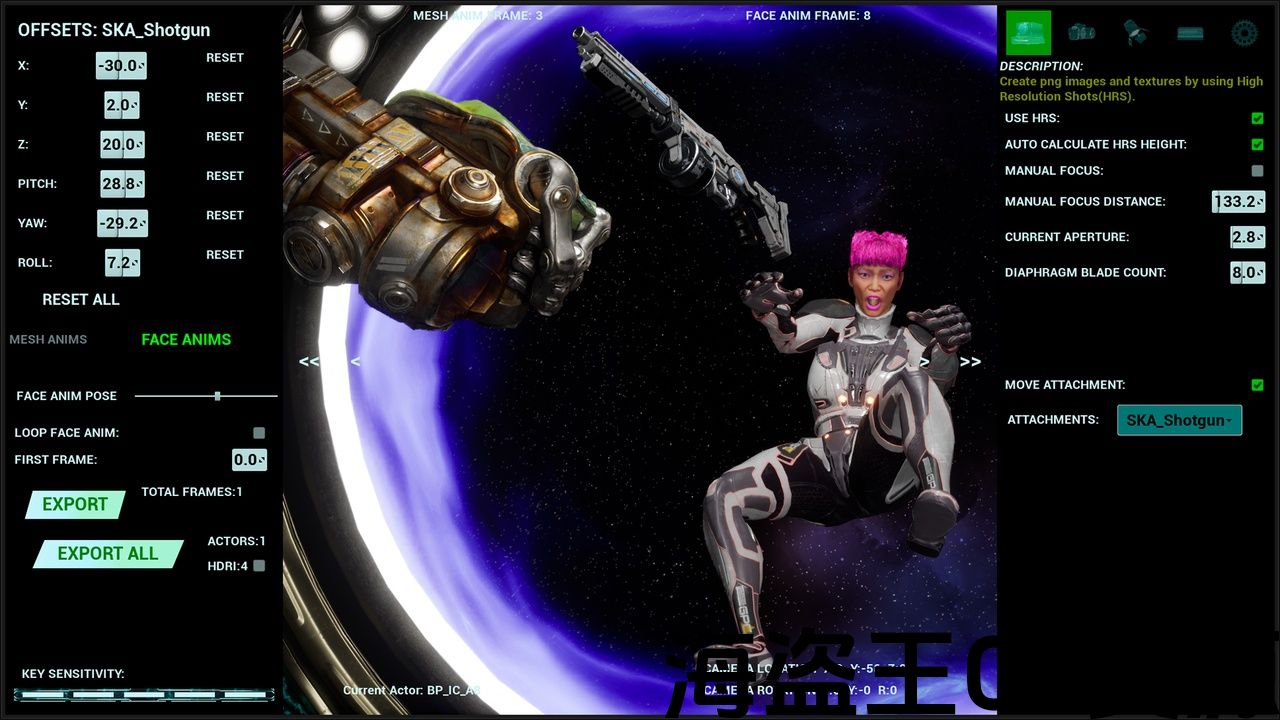 - Keyboard shortcuts included for movement (reset key available), rotation (reset key available), zoom, next actor, previous actor, next frame(if applicable), previous frame(if applicable), hide menus, save current preset at runtime.
