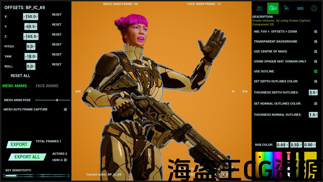 - 骨骼动画姿势运行时控制滑块可用,可选择在运行时自动导出每个帧或选定的自定义帧范围。 通过键盘进一步精细控制下一帧或上一帧(默认为1和2)。 现在添加了额外的面部动画控件。