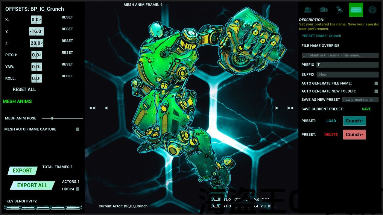 - 键盘快捷键包括移动(重置键可用),旋转(重置键可用),缩放,下一个演员,上一个演员,下一帧(如果适用),上一帧(如果适用),隐藏菜单,在运行时保存当前预设。