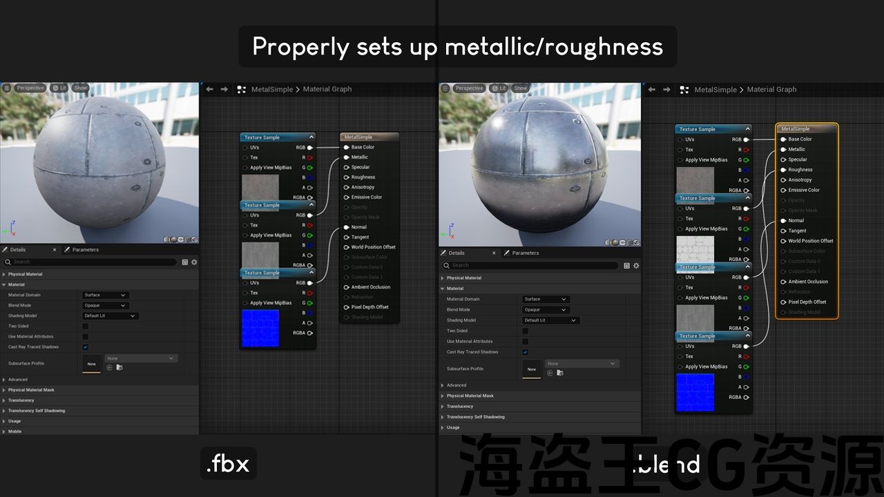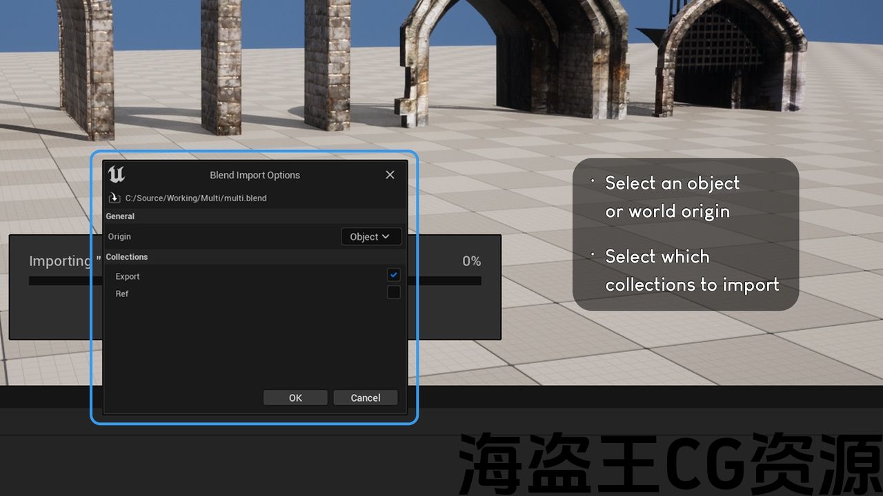 请注意 这个插件使用标准的FBX模型导入管道和您的.blend文件应遵循常规准则,并且将面临与将FBX模型导入UE时相同的限制,例如,不会导入基于节点的复杂材质,也不会导入摄像机。 特别是准备继续需要重建您的材料在虚幻后导入。