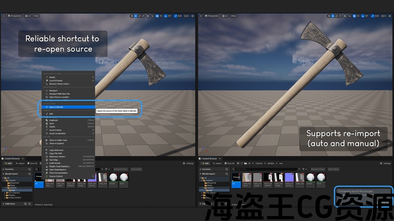Through the right-click context menu you can directly open the source again in Blender for editing. Then simply save your changes, and with support for automatic re-import, you have a great workflow for quickly iterating on 3D assets!