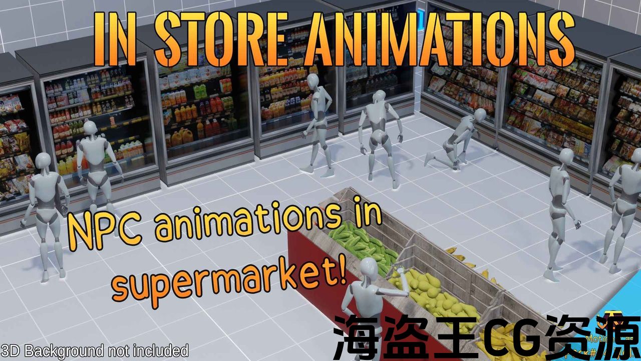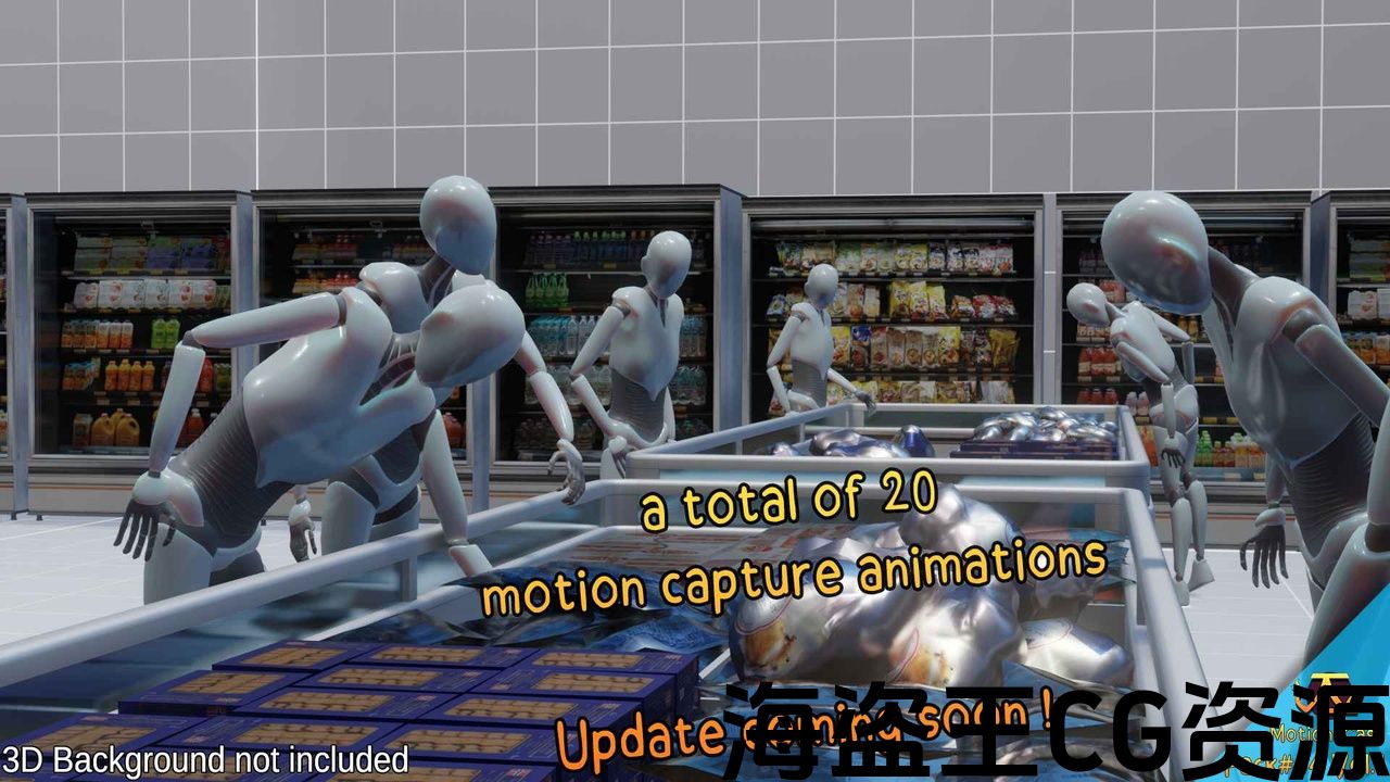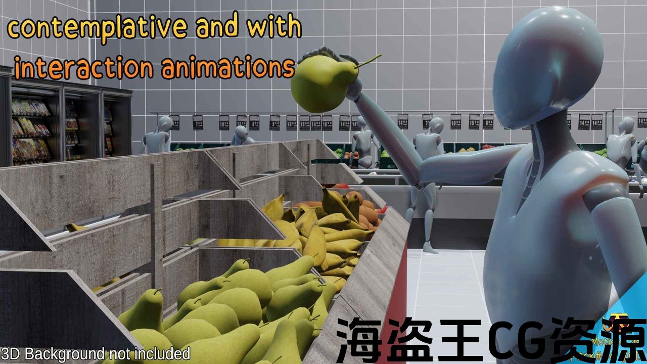在这个动画包中,我们想象了你可以在超市里找到什么样的动画。 我们在创建动画时考虑到在超市中发生的3d动画时,我们可以在后台使用动画类型。 我们制作了客户在超市货架上走动的动画,他们与他们互动与否。 但我们也制作了超市员工的动画。 这个包包含20个动画。 所有动画都以30FPS的速度在动作捕捉中捕获并手动修饰。 动作捕捉是由Stéphane Pfeffer执行的,他做了很多戏剧。
