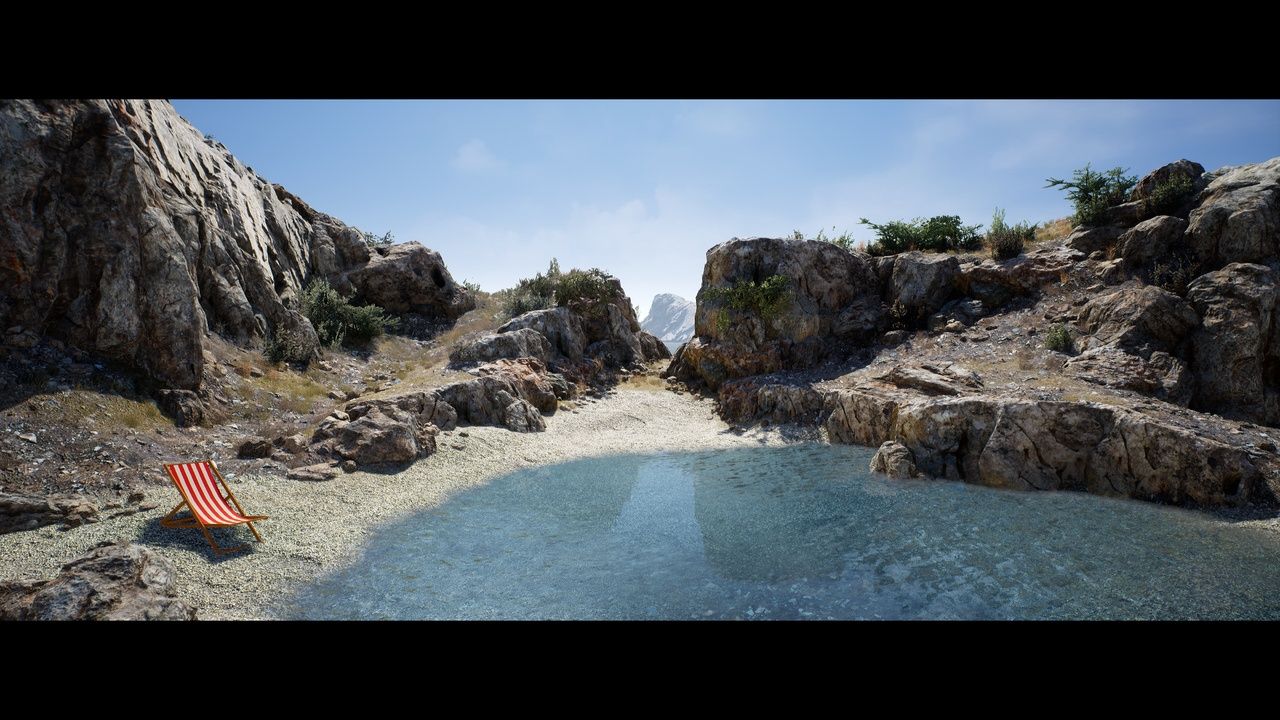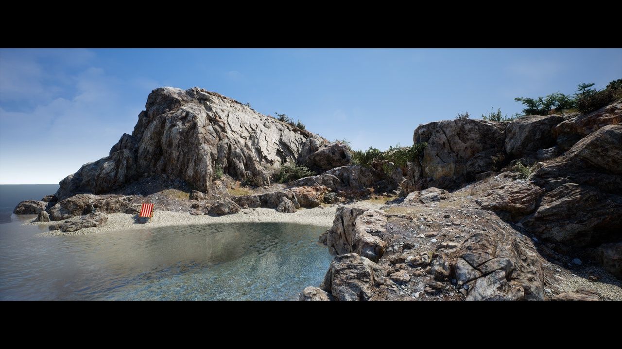 Texture Size: (3) sets of 4k textures for big cliffs and rocks, (3) sets of 2k textures for ground materials, (2) sets of 2k and (2) sets of 512 textures for vegetaion assets, (3) sets of 1k textures for small rocks and sunchair,