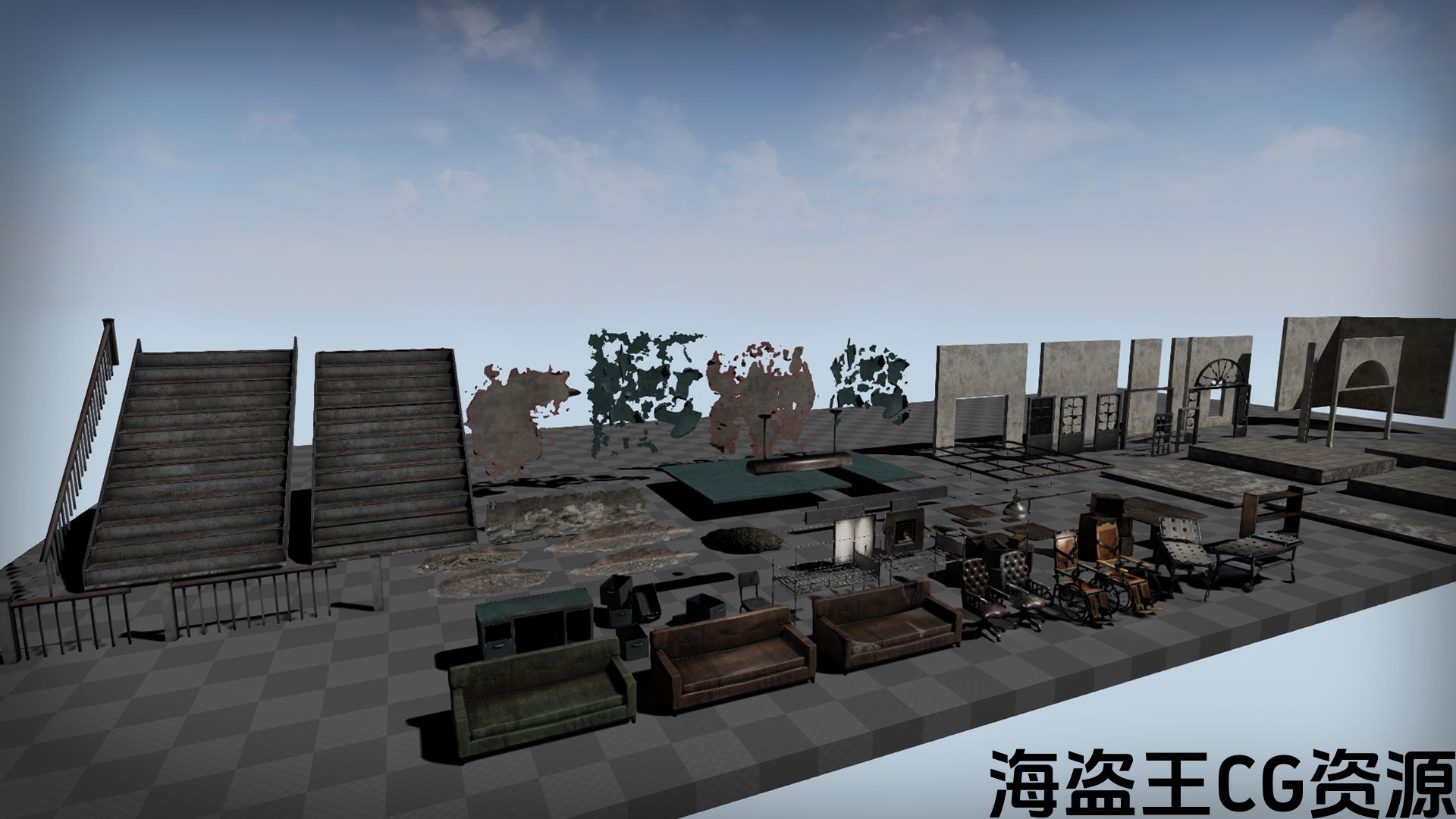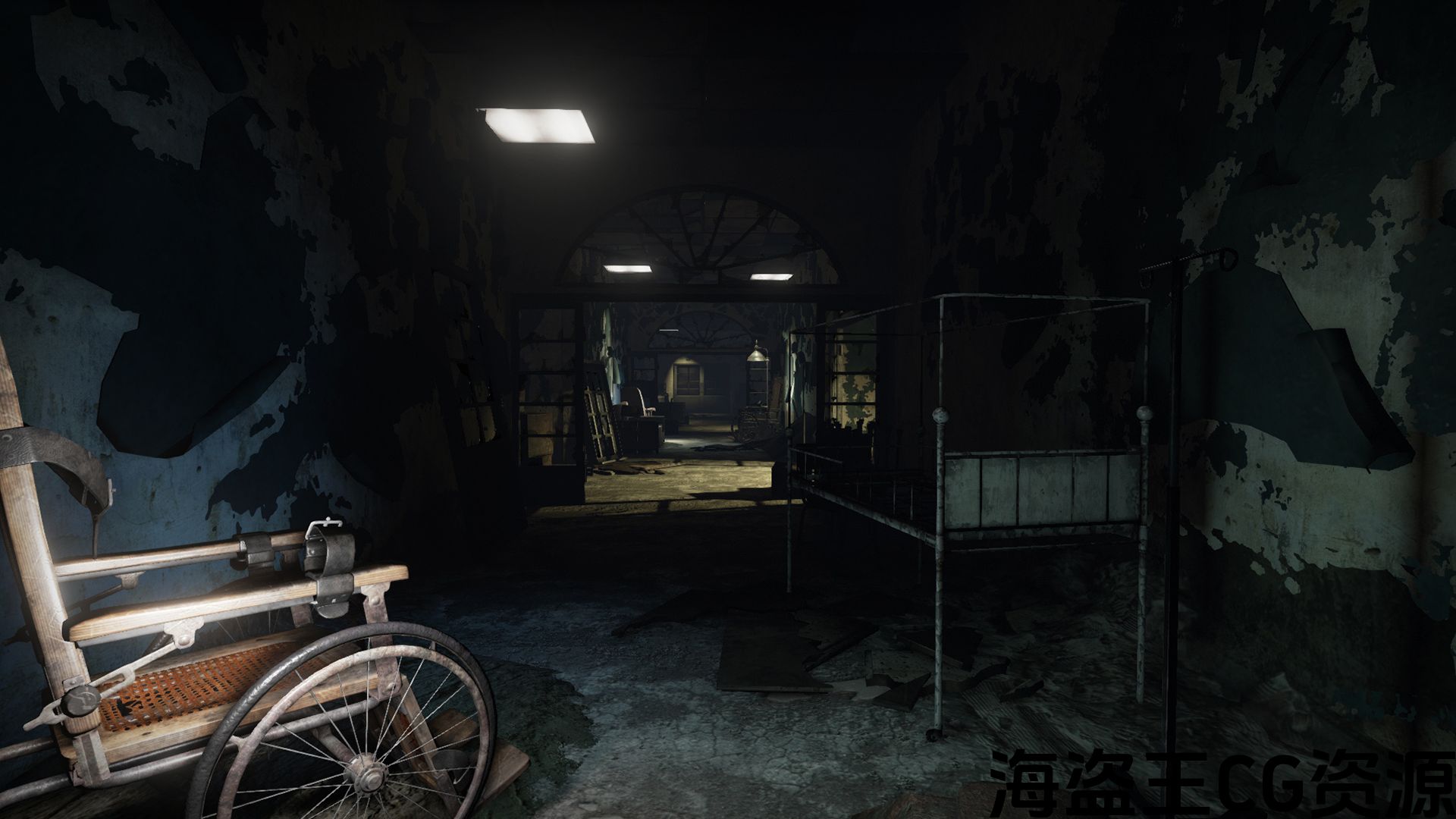 这个包包含模块化墙壁,天花板,地板,楼梯和阳台网格以及用于建造废弃医院内部空间的装饰道具。