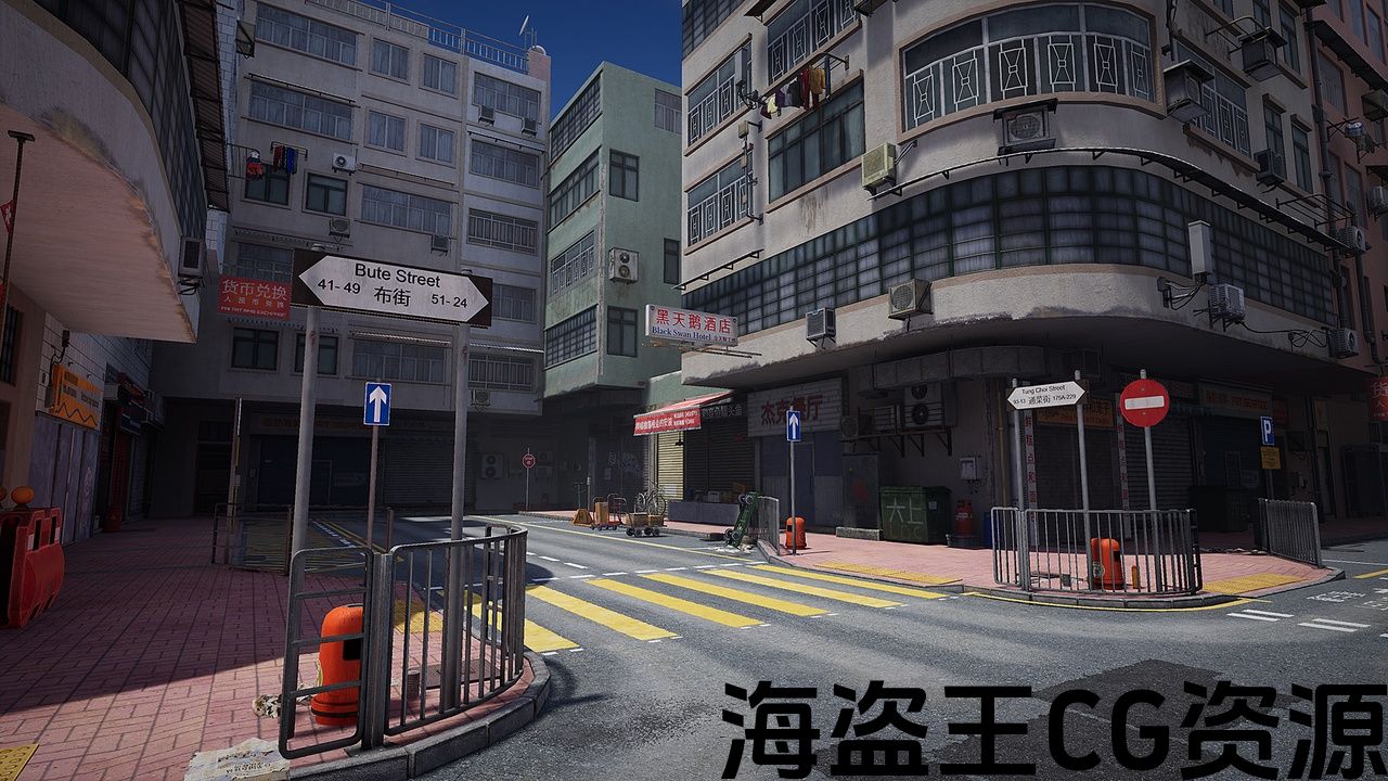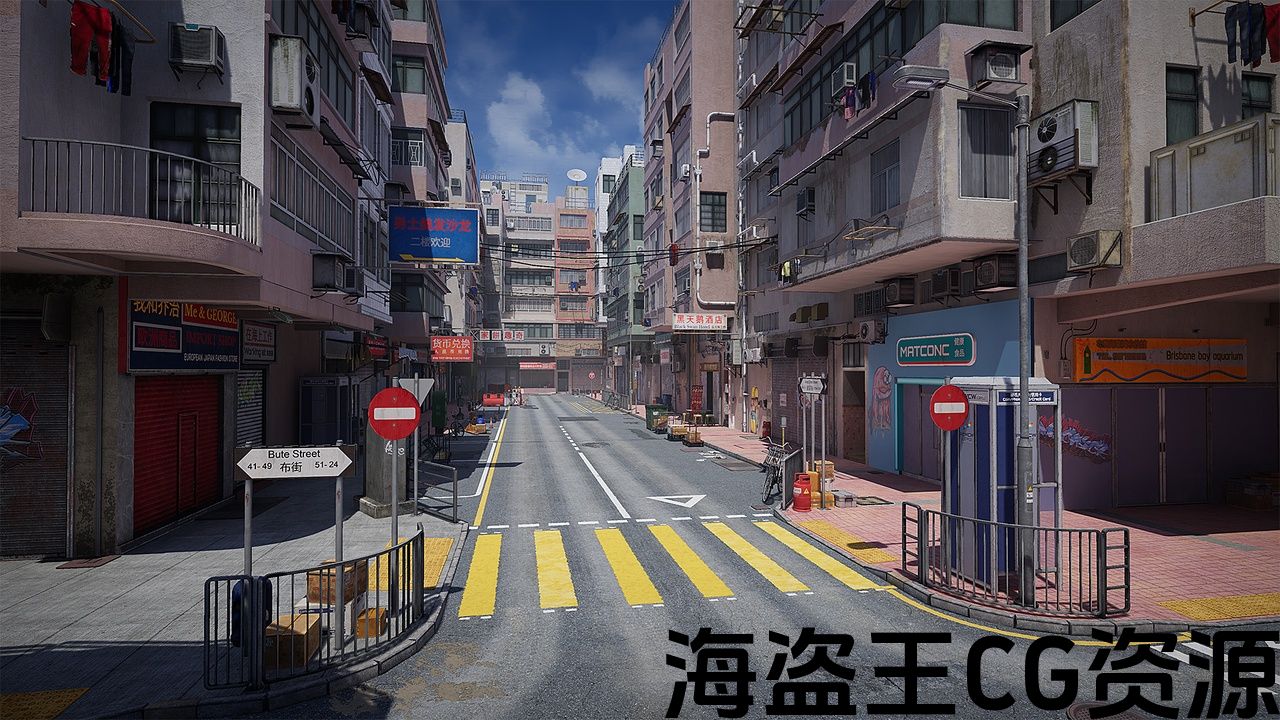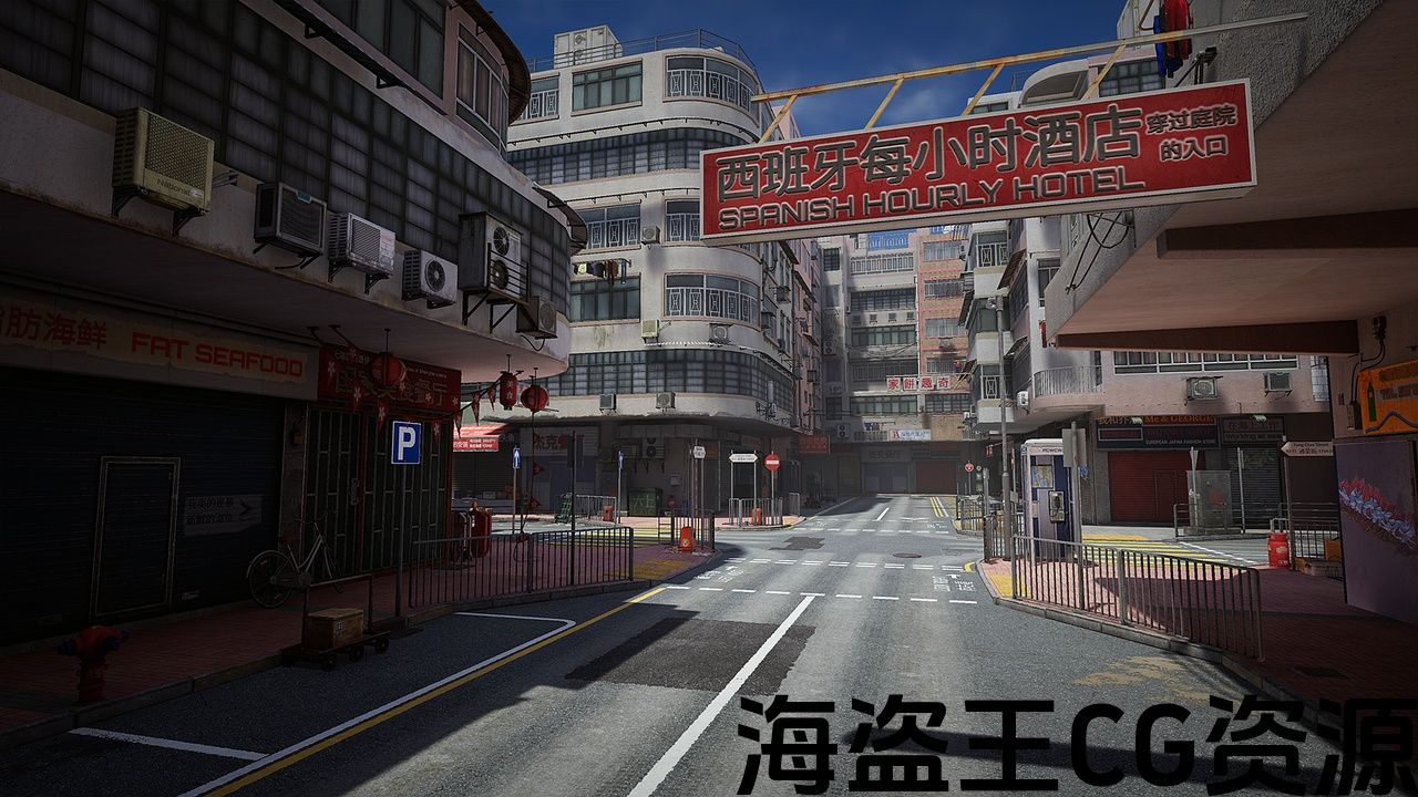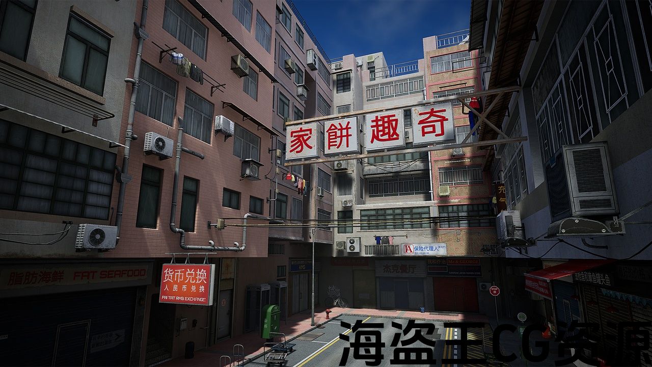 An ordinary Hong Kong street, with an infinite number of air conditioners, manholes on the roads and carts with crates.