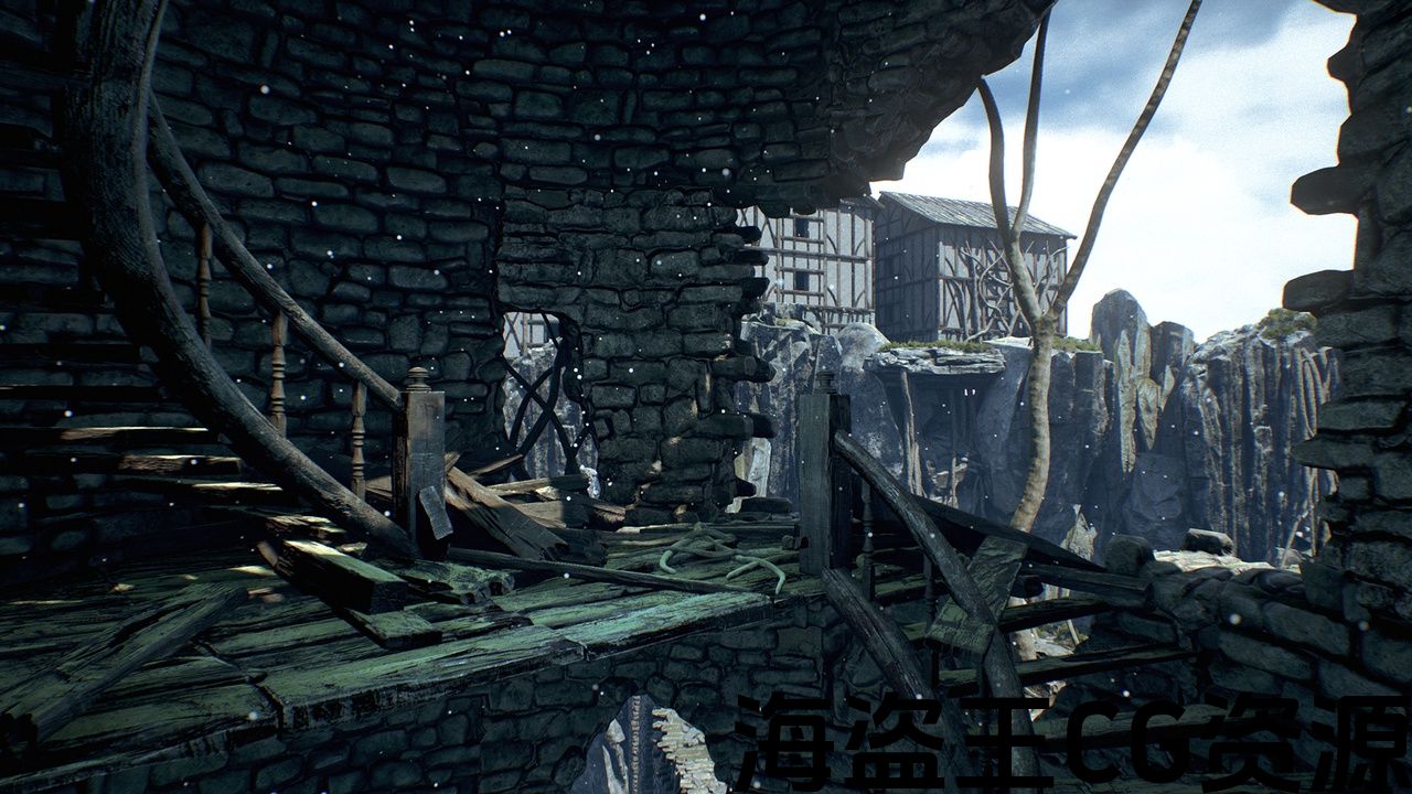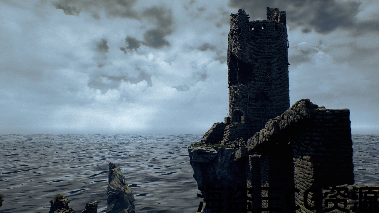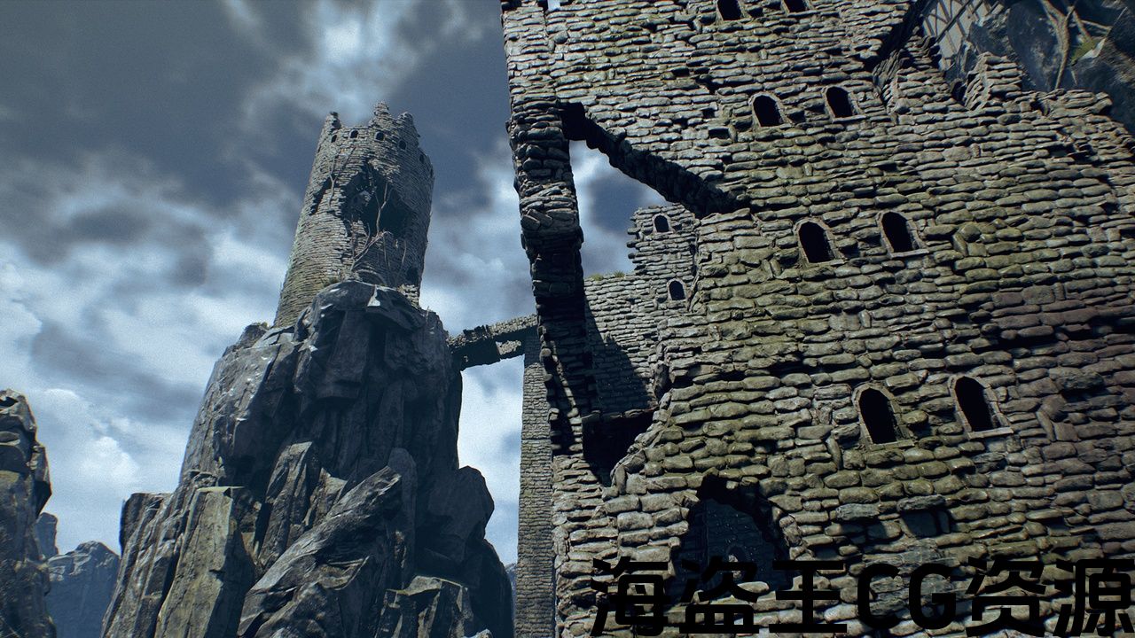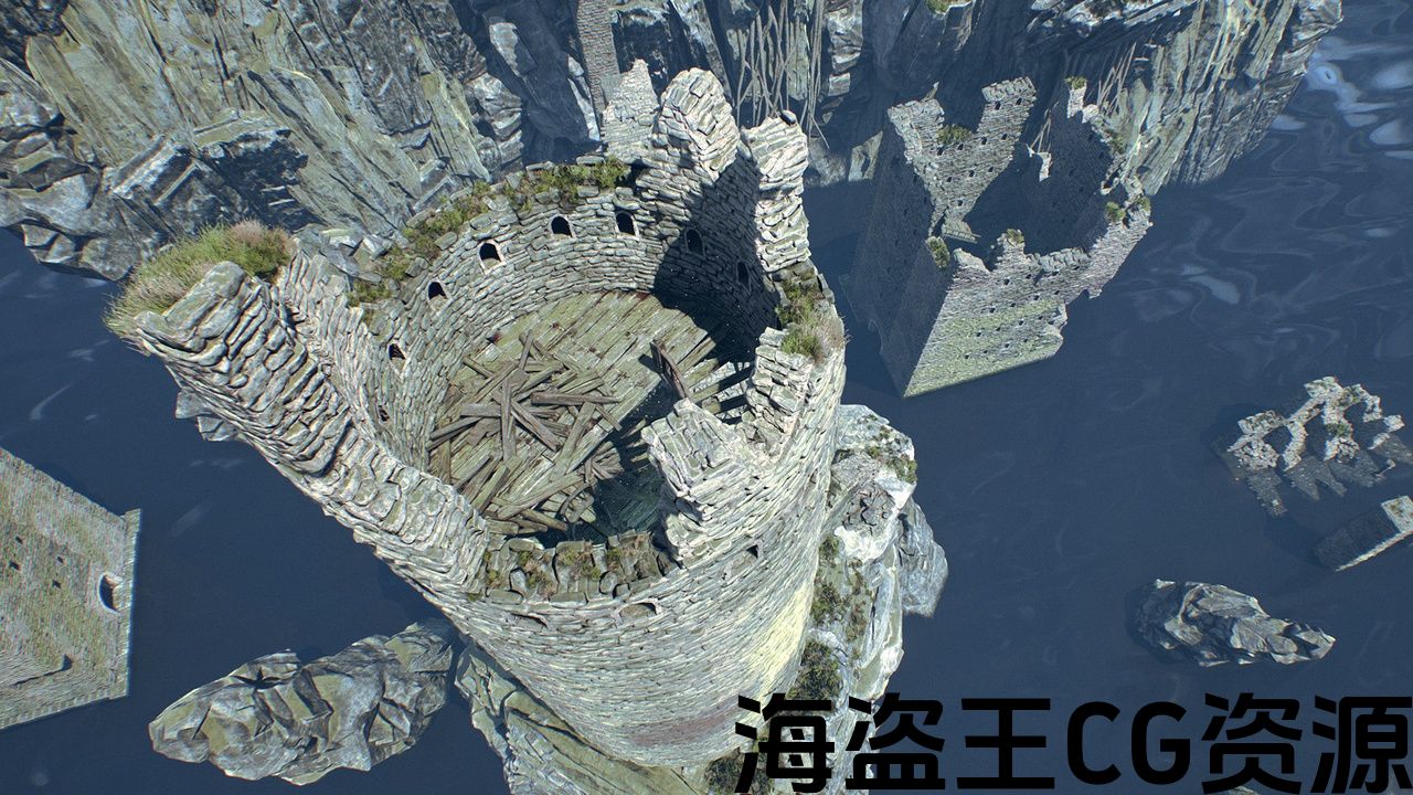 92高品质的模型和纹理的老建筑,废墟塔,悬崖,树叶,藤蔓和木板。
