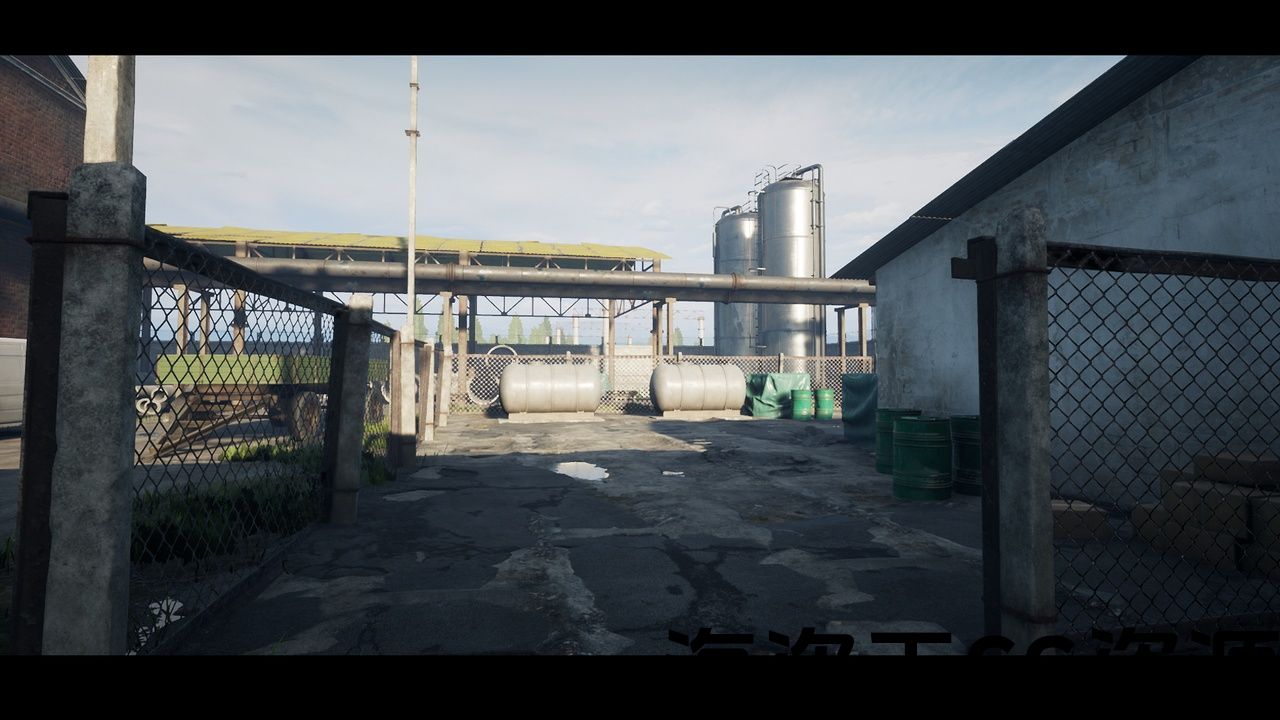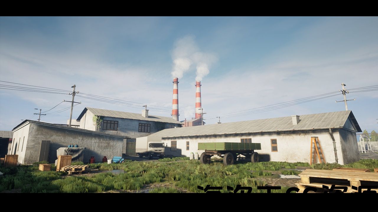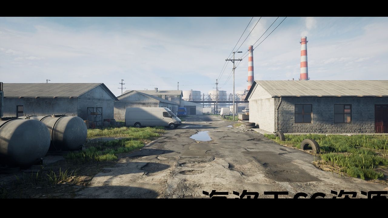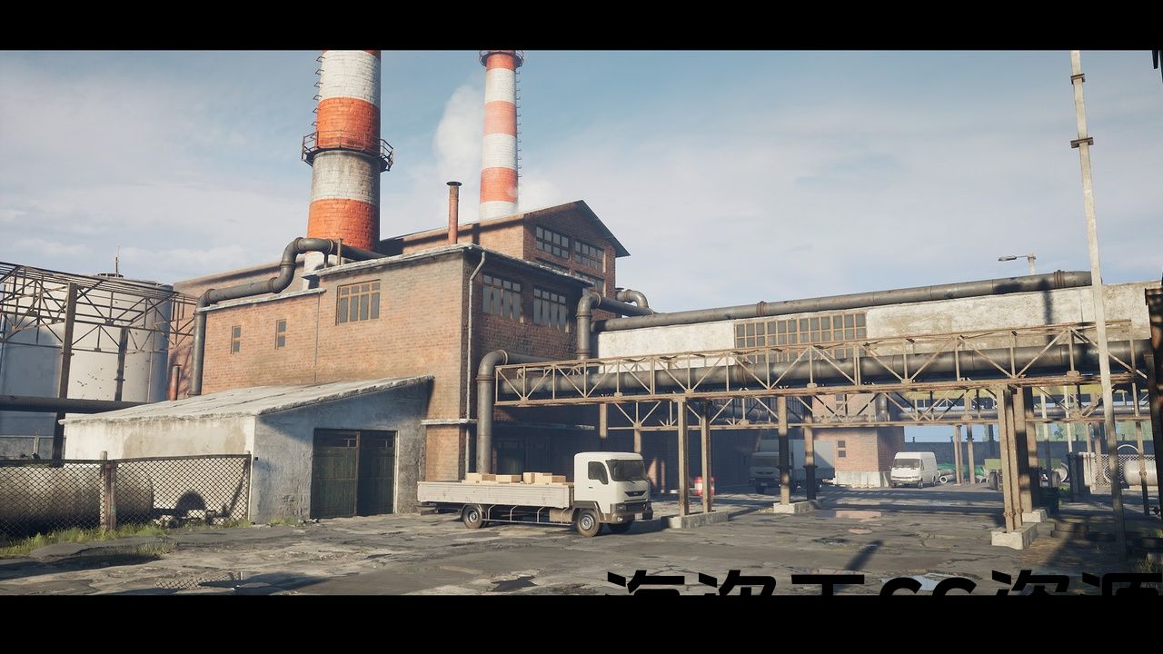 Old factory industrial environment, includes modular buildings with interiors, props and vehicles.