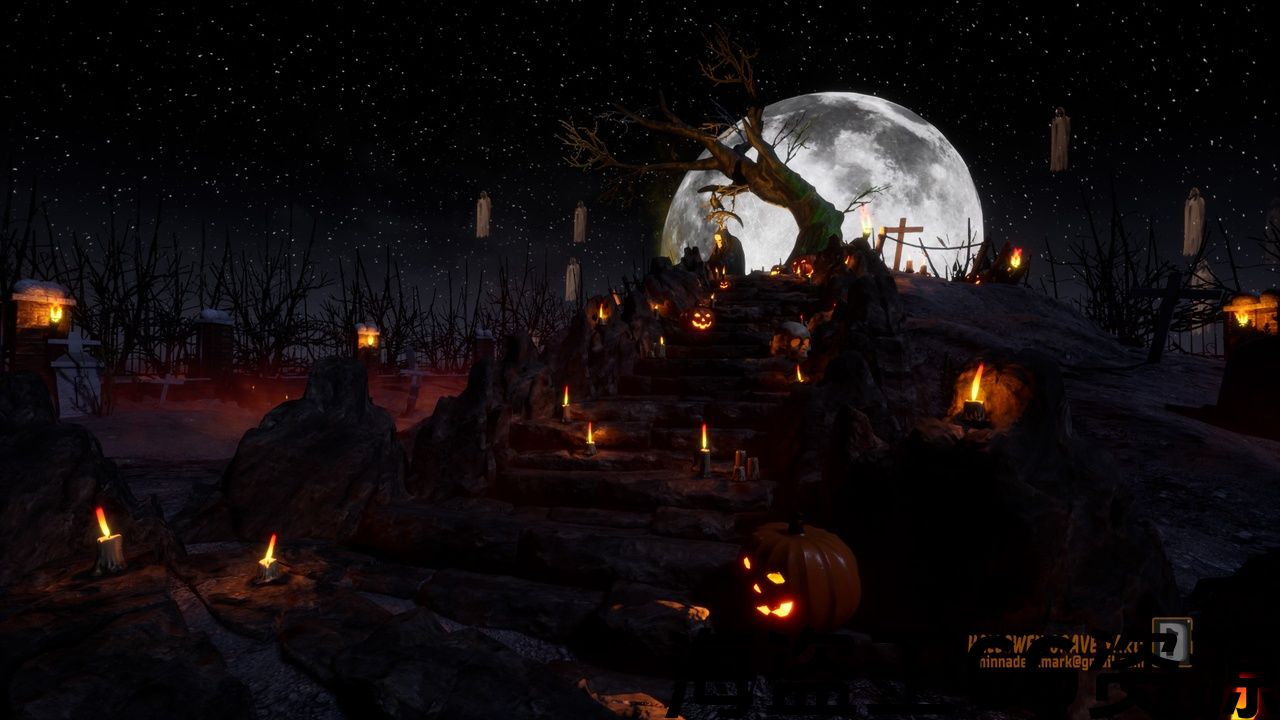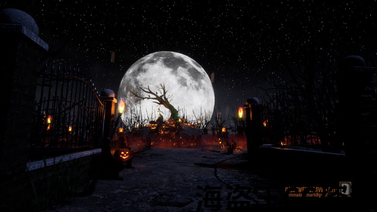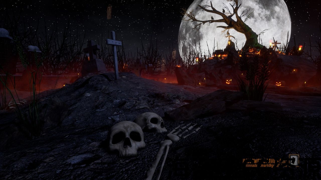 Scary graveyard with bones, corps, coffin and gravestones, Decorated for Halloween night.