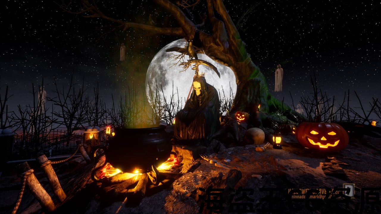 可怕的墓地与骨头,军团,棺材和墓碑,装饰万圣节之夜。