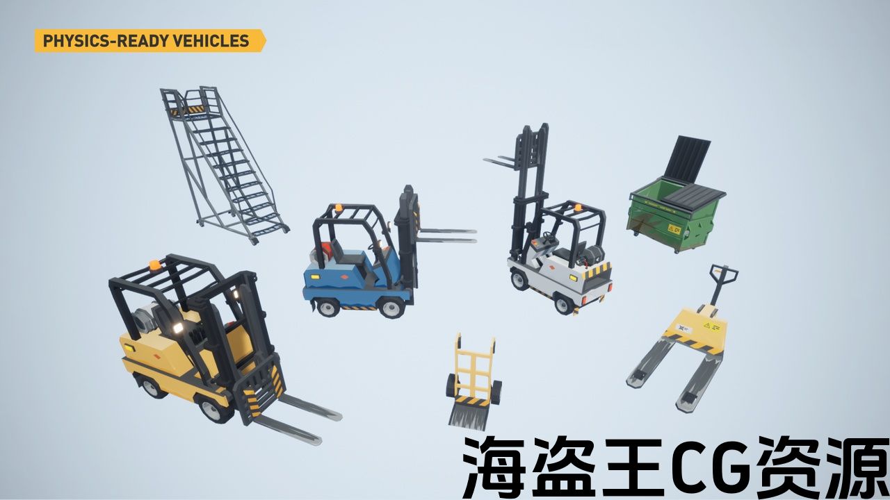 一个灵活的风格化资产包,这是一个伟大的起点,创造一个有趣的仓库内部。 模块化的墙壁,地板和屋顶允许您创建几乎任何大小或形状的建筑,同时提供了各种各样的道具—桶,瓶子,盒子和护柱来填充场景。 包括一个物理就绪叉车与铰接多级升降机,托盘千斤顶,包裹手推车,漫游楼梯和一个带移动盖子的轮式垃圾箱。