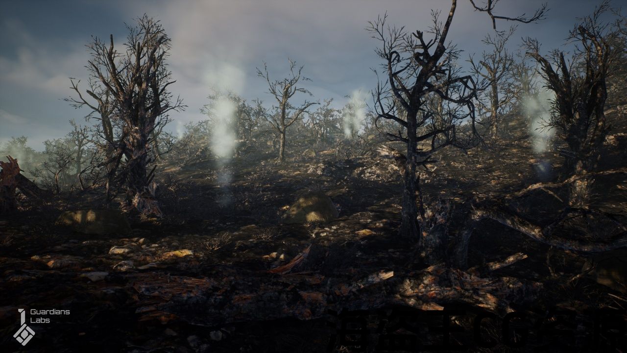 另一个好处是”自动”燃烧效果的系统。 使用燃烧的材质在地形上绘制-导出weightmap纹理并将其导入为燃烧的地图-自动放置在燃烧区域中的每个资源都将获得过渡效果!