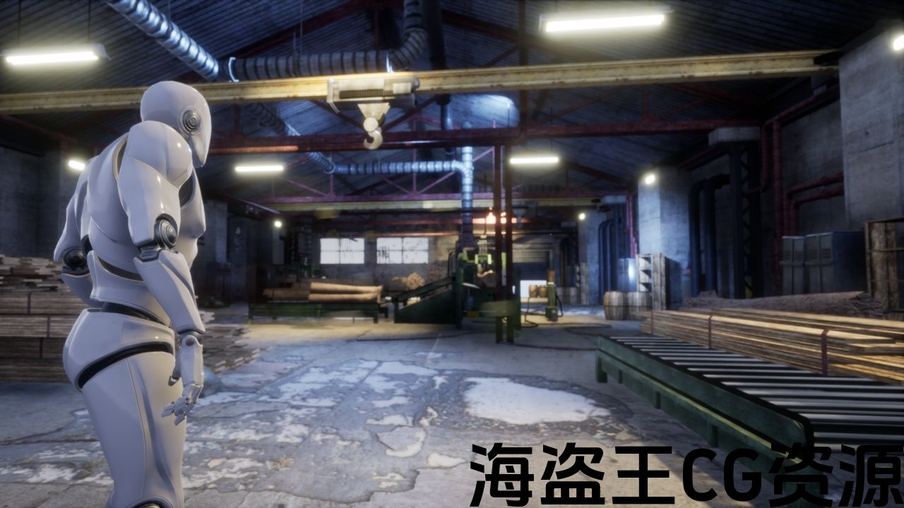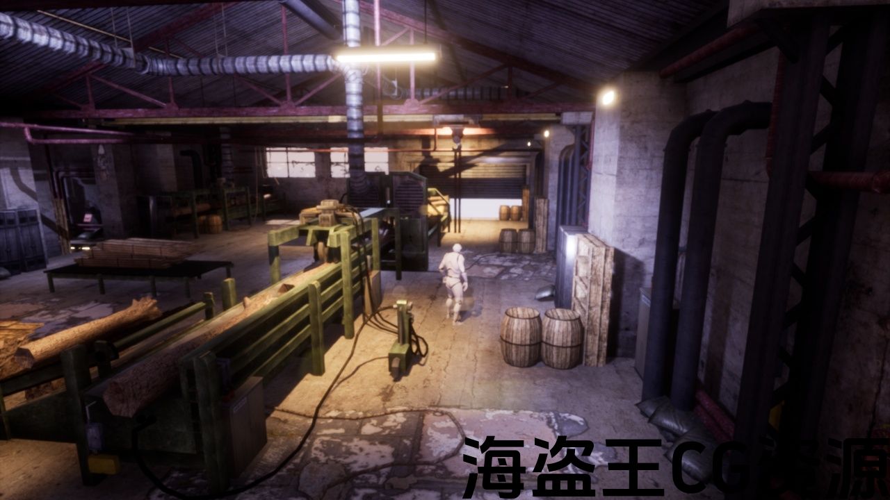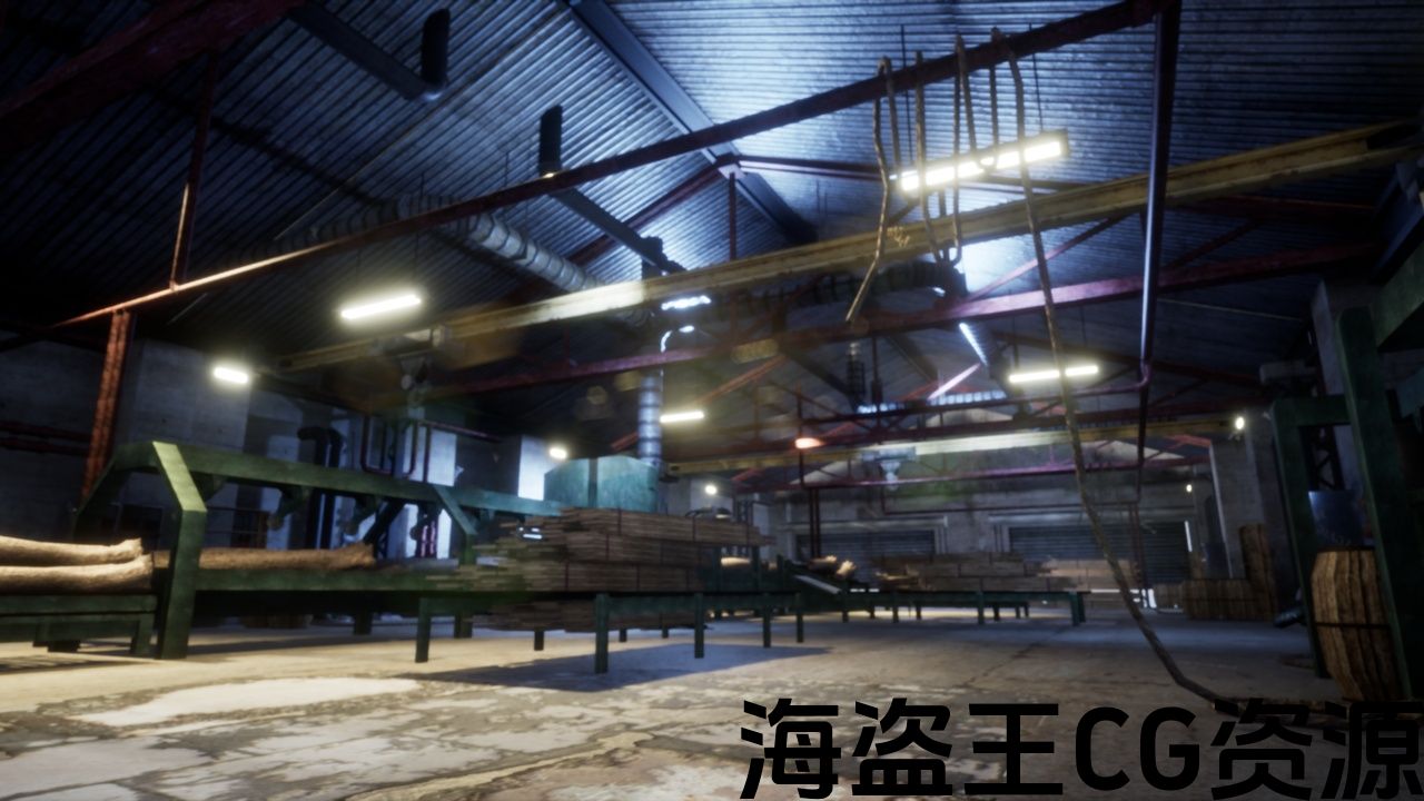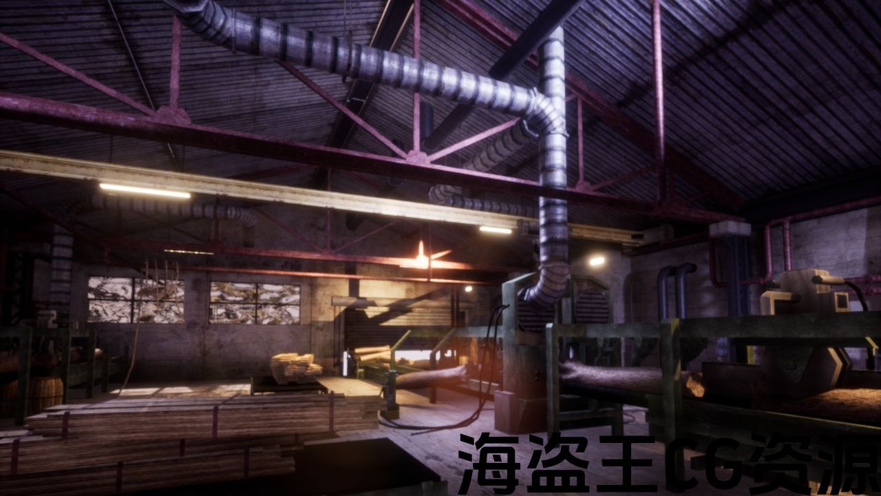 工业内部水平与机械和城市氛围,使用视觉布局和艺术风格的基础上的锯木厂内部。