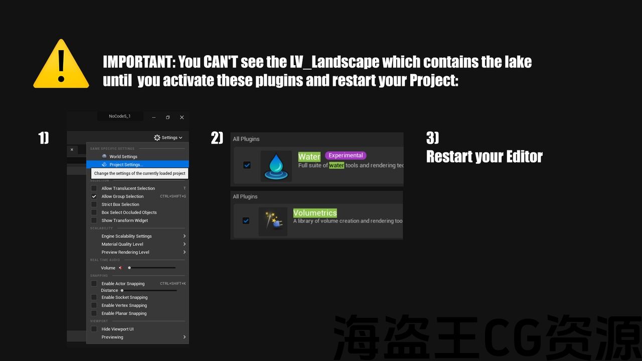 ⚠️⚠️重要事项 ⚠️⚠️: 这个项目使用”水插件”为绿洲和”体积插件”为一些云。 请确保在项目中启用了它们。 这两个插件都来自Epic,您不需要下载任何额外的文件。