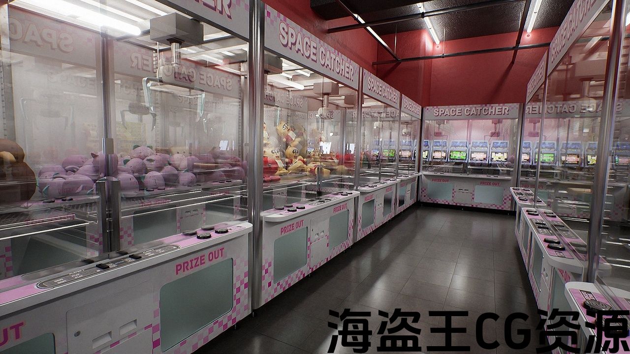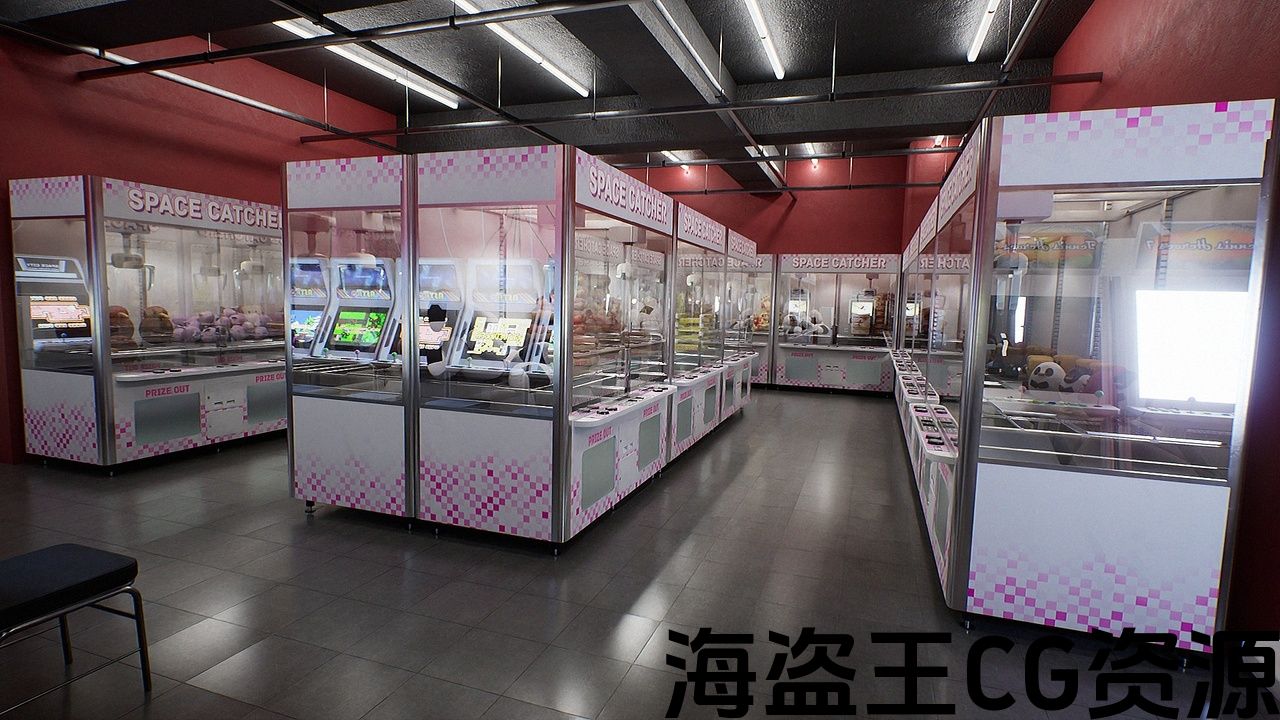Included models: 4 different arcade cabinets, A basketball throwing game, a mole whacker game, a car racing game, an aeroplane simulator game, several stools, claw machine, 11 claw machine rewards props with 29 material variants, lamps, wires, wire holders, AC, money exchanger