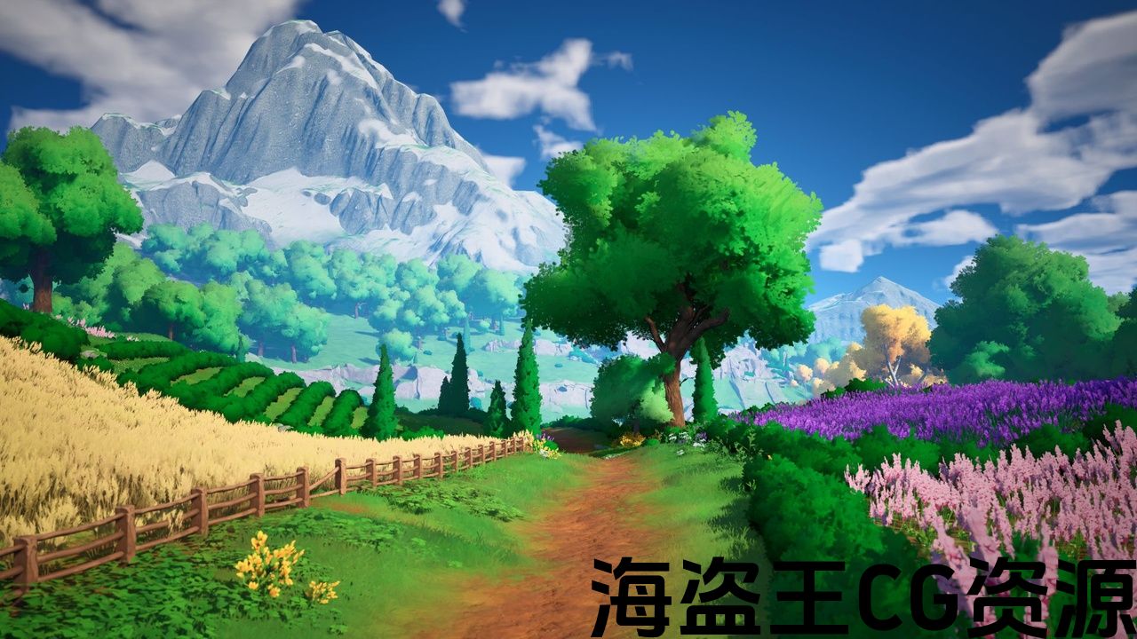 Stylized Meadows environnement, including demo map with large terrain, fluffy trees, rivers, and agriculture fields.