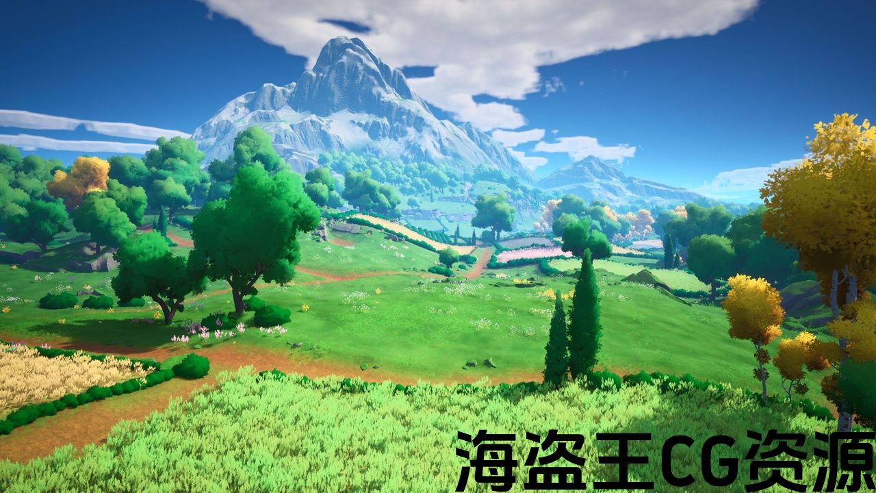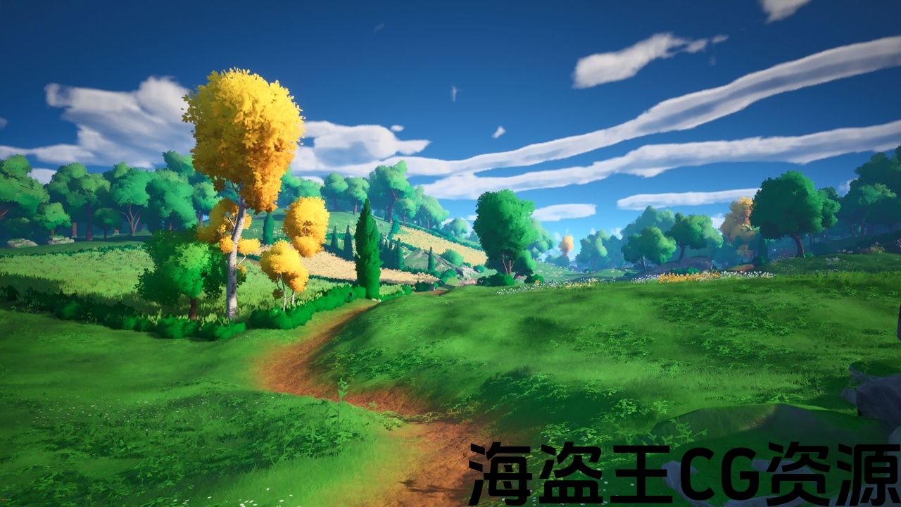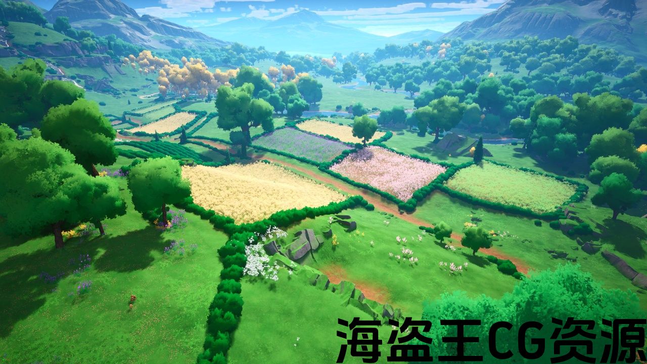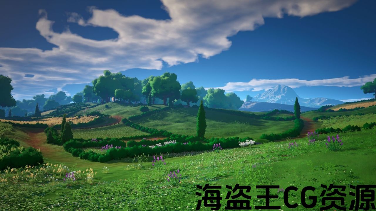 风格化的草地环境,包括演示地图与大地形,蓬松的树木,河流和农田。
