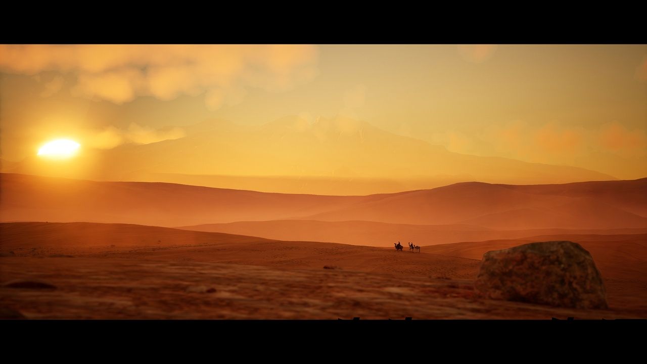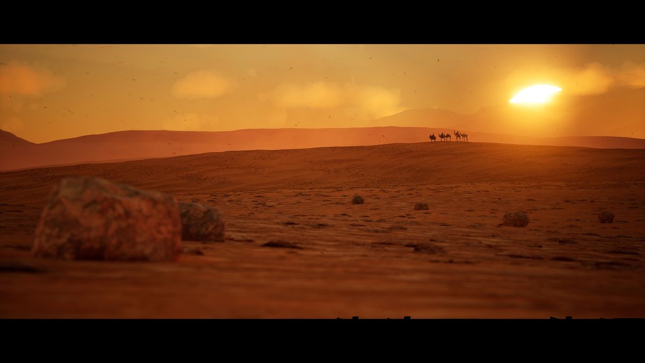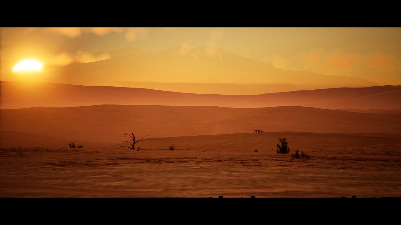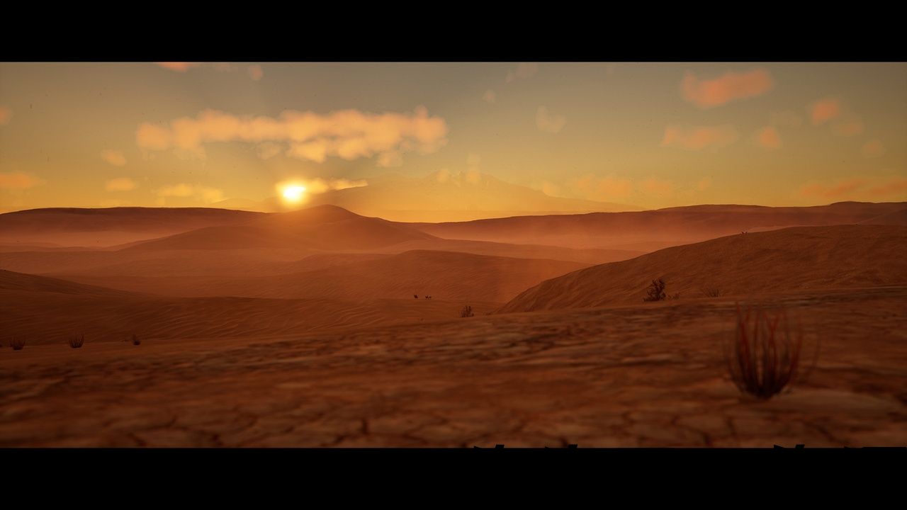 Full desert dune landscape featuring over 900 km of vista views across a 360 horizon, a wide range of material blending with procedural scattered foliage such as boulders, gravel, and foliage that are highly versatile.