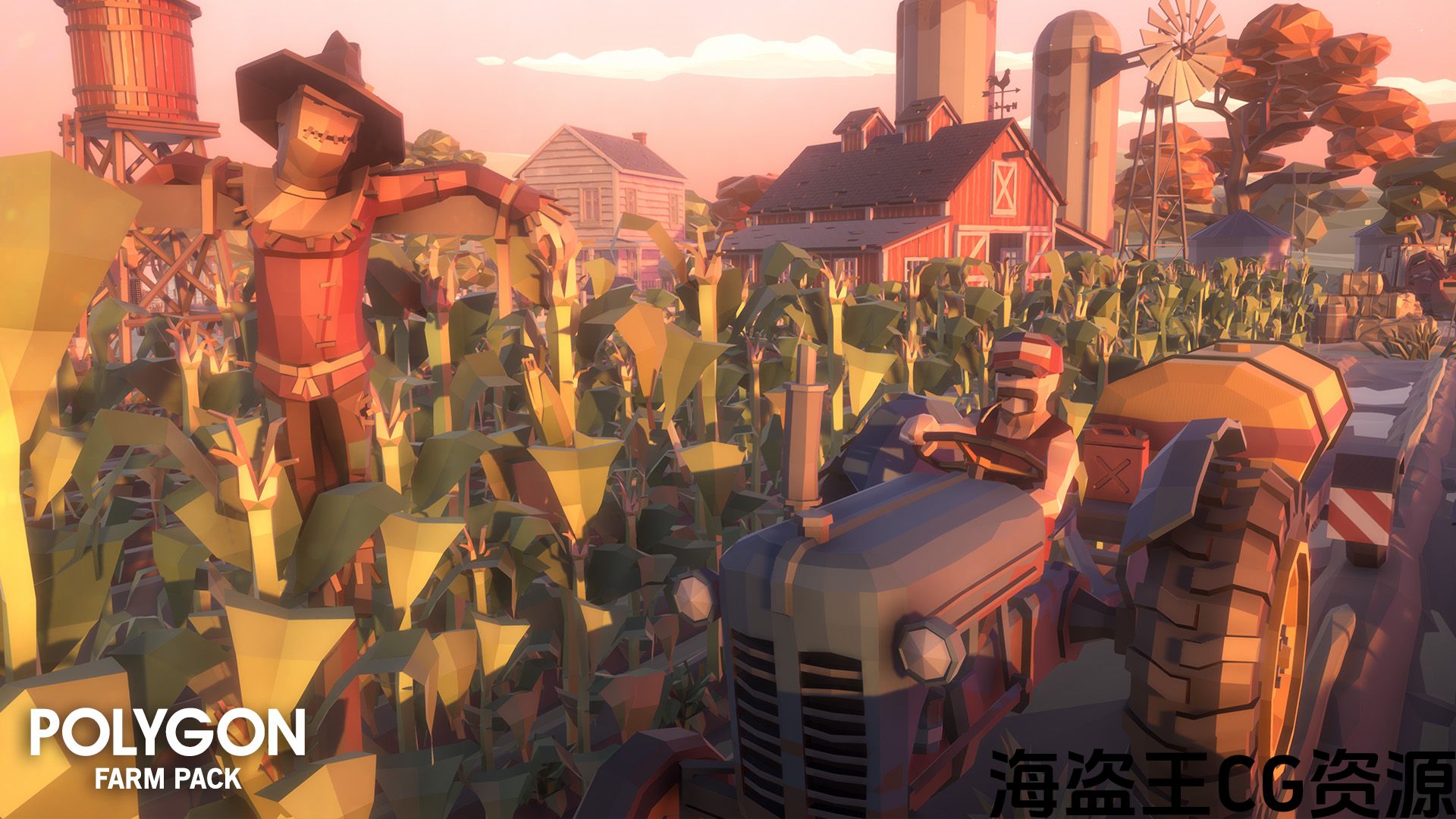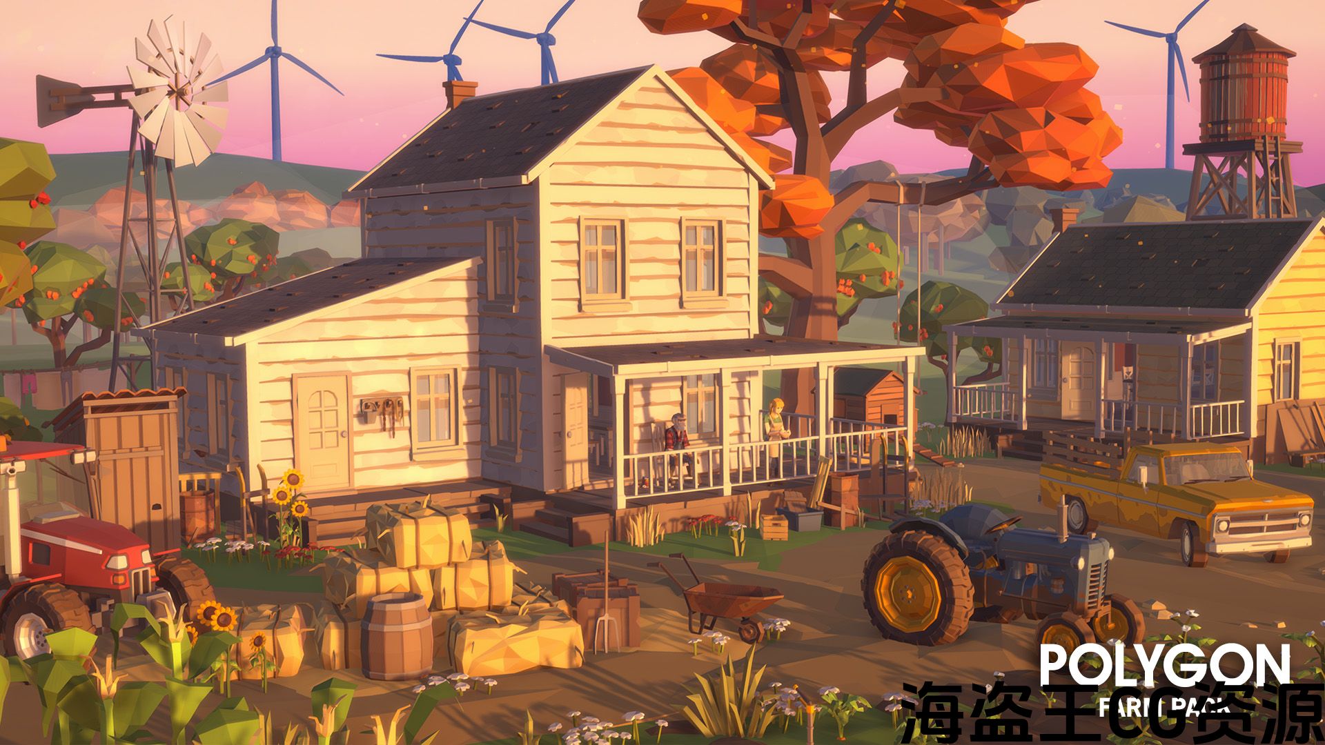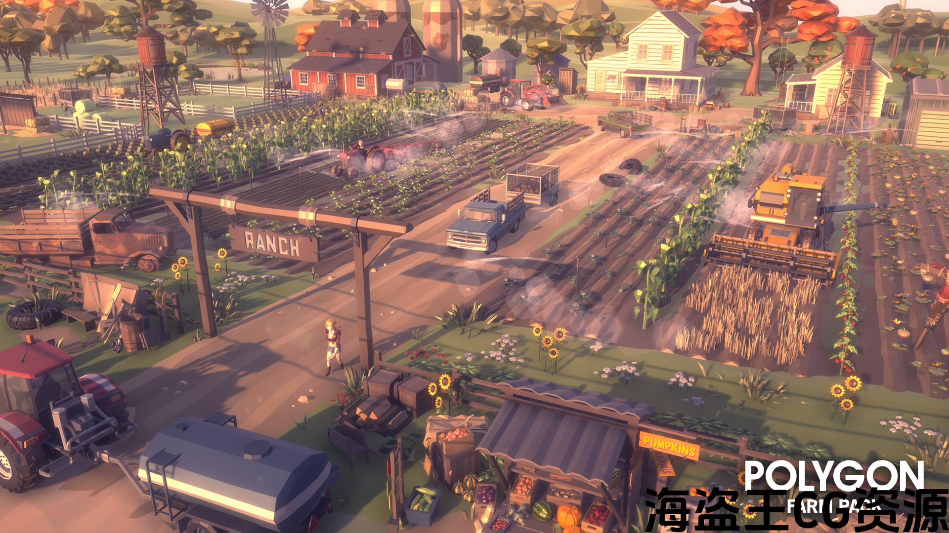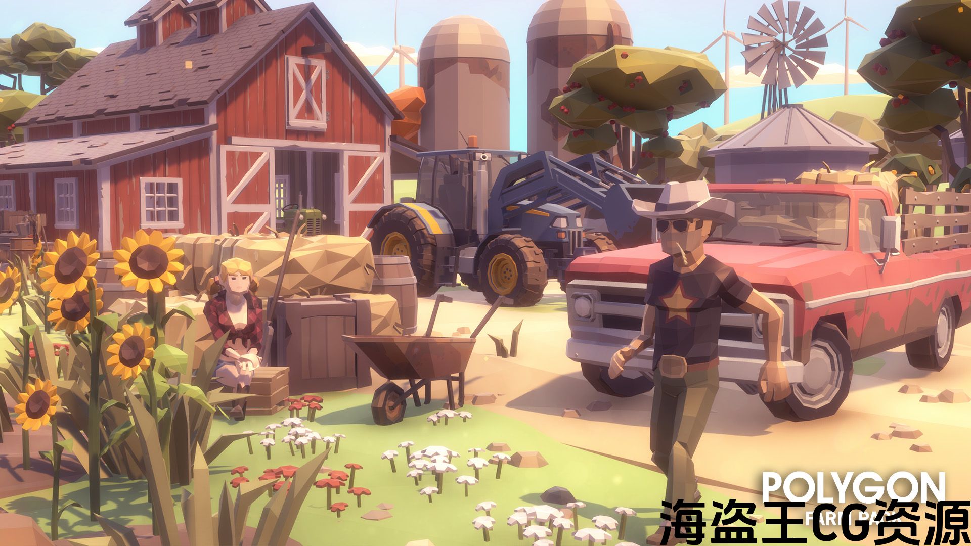 Synty工作室提出-一个低聚资产包的建筑物,车辆,人物,植物和道具资产创建一个农场主题多边形风格的游戏。
