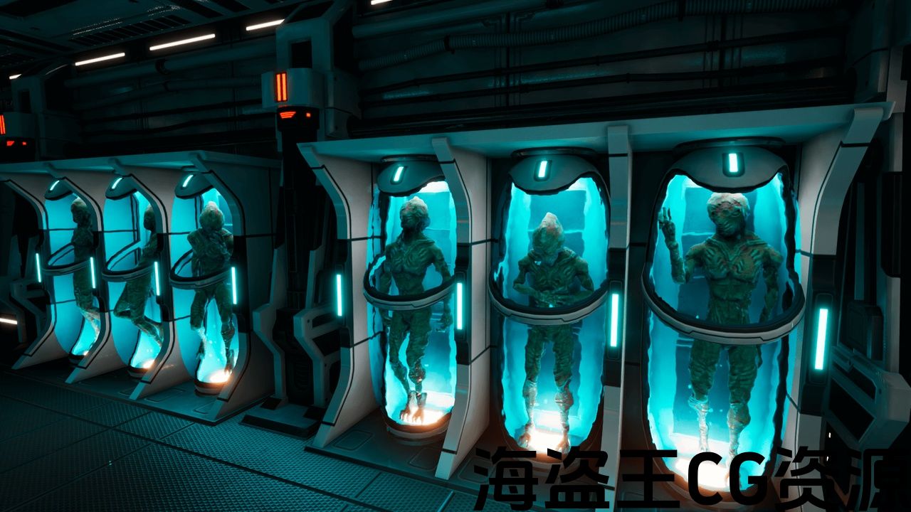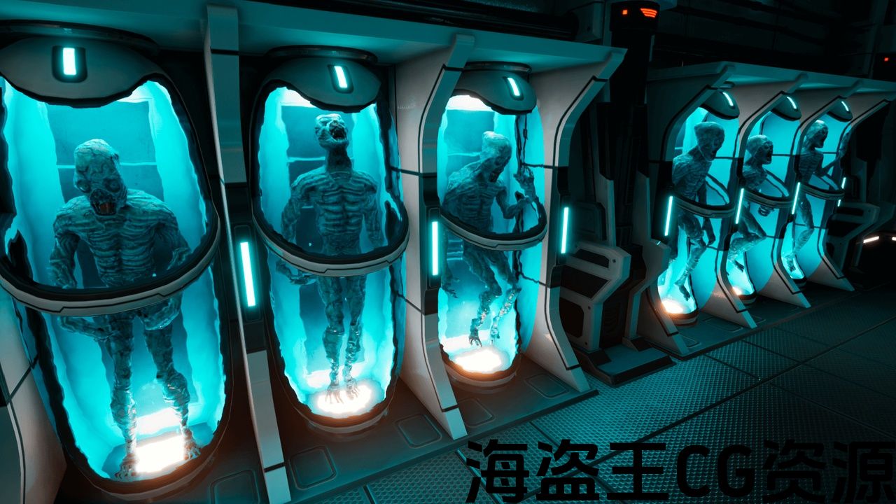 Sci-Fi cryogenic room featuring cryo capsules containing 2 various creatures. Cryo capsule is designed with transparent surfaces that allow a clear view of the creatures in stasis. Perfect for VR experiences, Sci-Fi space stations, research facilities.