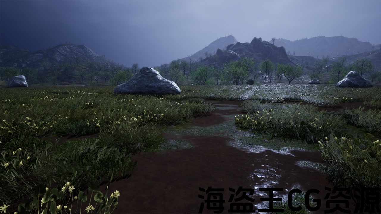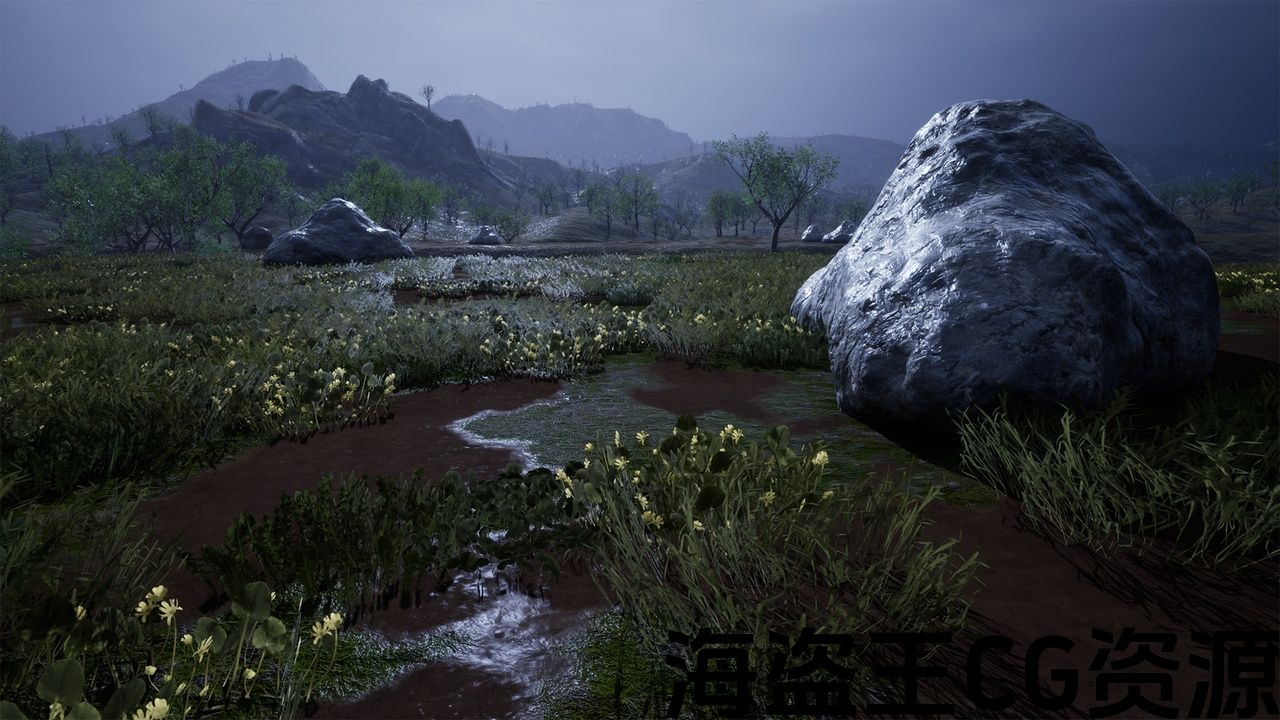 岩石有一个非常聪明的材料,这将允许你升级他们数百次没有显着的质量和纹理密度松散。 这就是为什么,一个简单的岩石可以用来创造一个巨大的悬崖,甚至一座山。 这个包中的所有材料都有很多参数,可以调整,以个性化的湿度,颜色,面具不仅为景观,而且为资产:草,树,岩石。 只需点击几下,借助材质实例中的参数,您就可以完全改变湿地的整体外观。