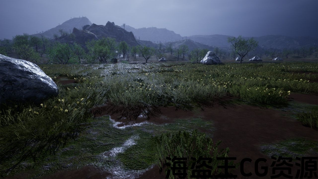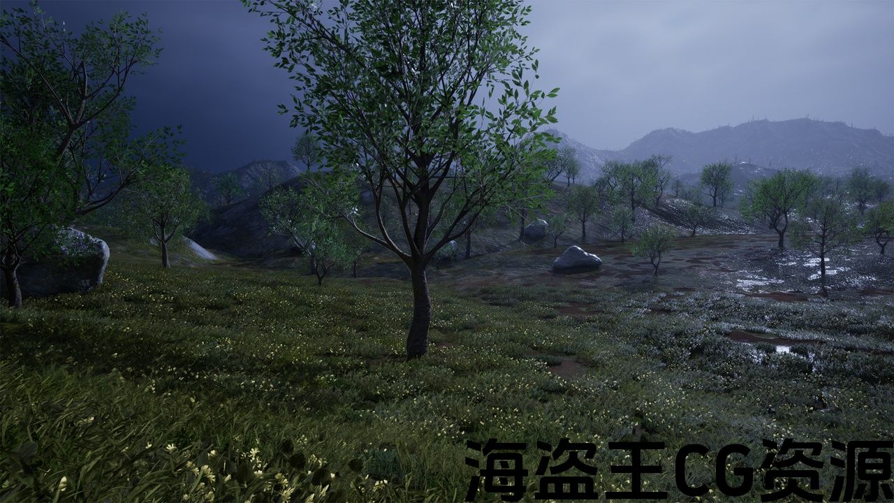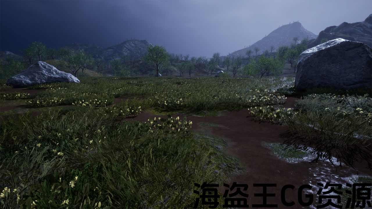 因为所有内容都是程序生成的(从地形材质,树叶,树木,岩石开始),您只需点击几下即可设计类似的地图。 一切都是为了速度和质量而创建的,它也是非常可定制的。 景观自动材料将适应您可能拥有的任何景观,在自动图层旁边,您可以使用其他图层手动绘制泥浆,湿砂,湿草,湿岩石/悬崖,湿砾石,湿路面等。 您在视频中看到和听到的所有内容都包含在这个包中:生成闪电和雷声的蓝图,雨粒子效果(尼亚加拉),特定的声音。 所有的资产都是为了在开放的世界地图中表现良好而创建的,因此对于充满泥泞和潮湿的巨大景观,一切都进行了很好的优化。