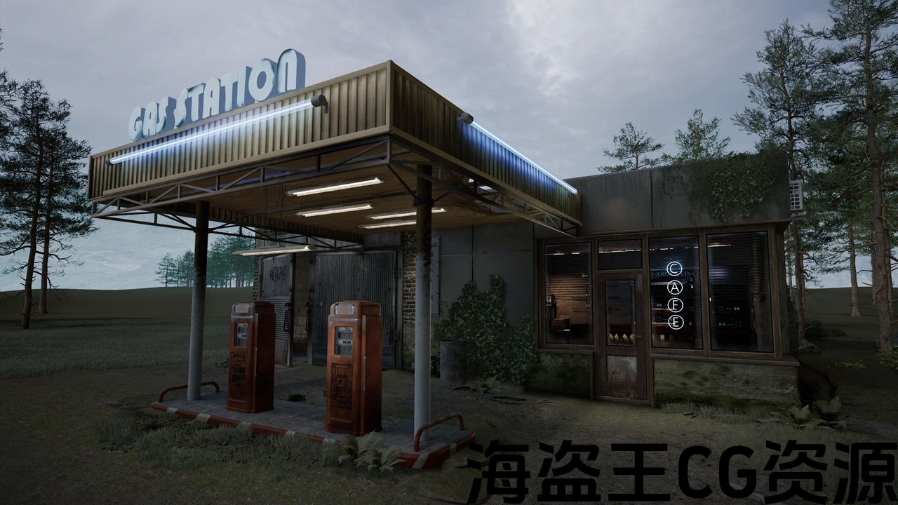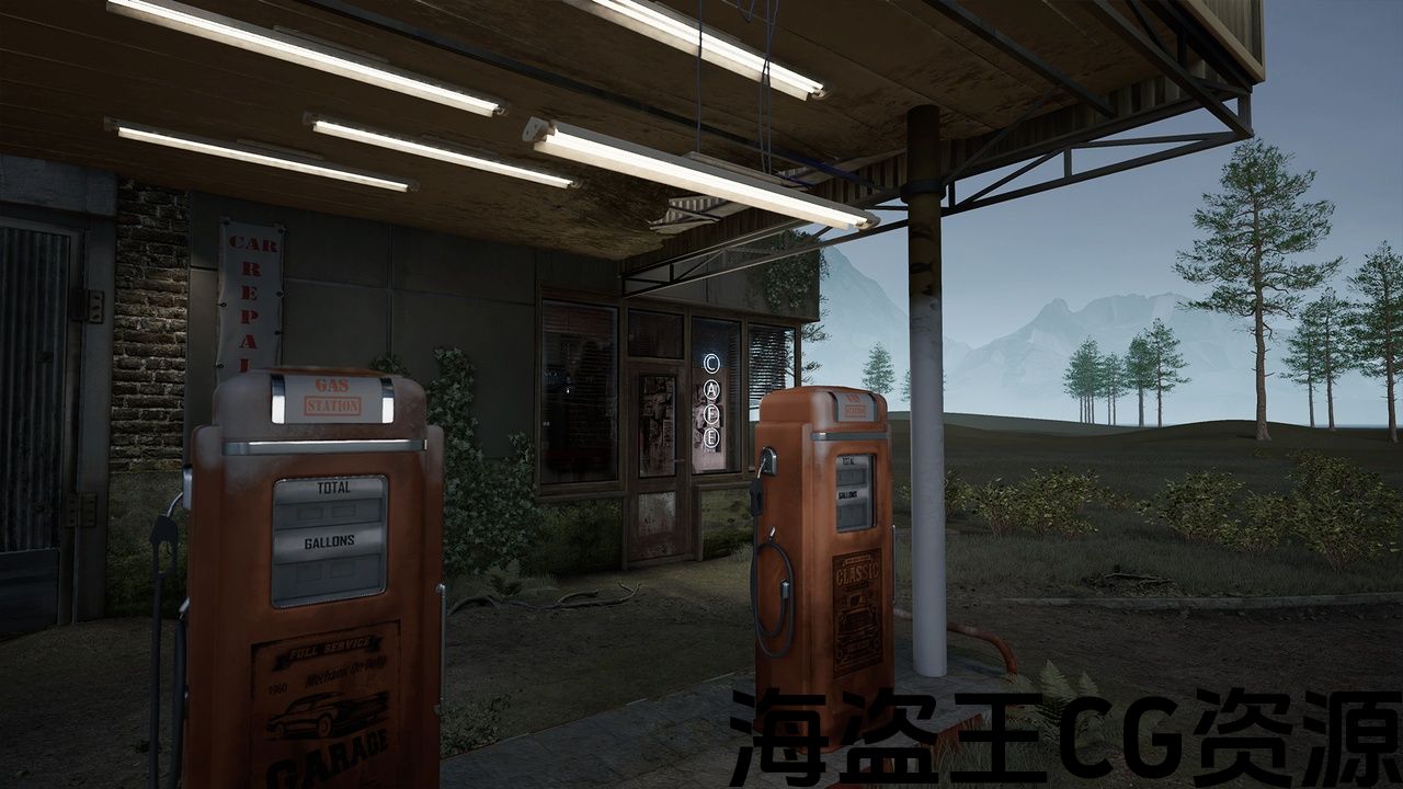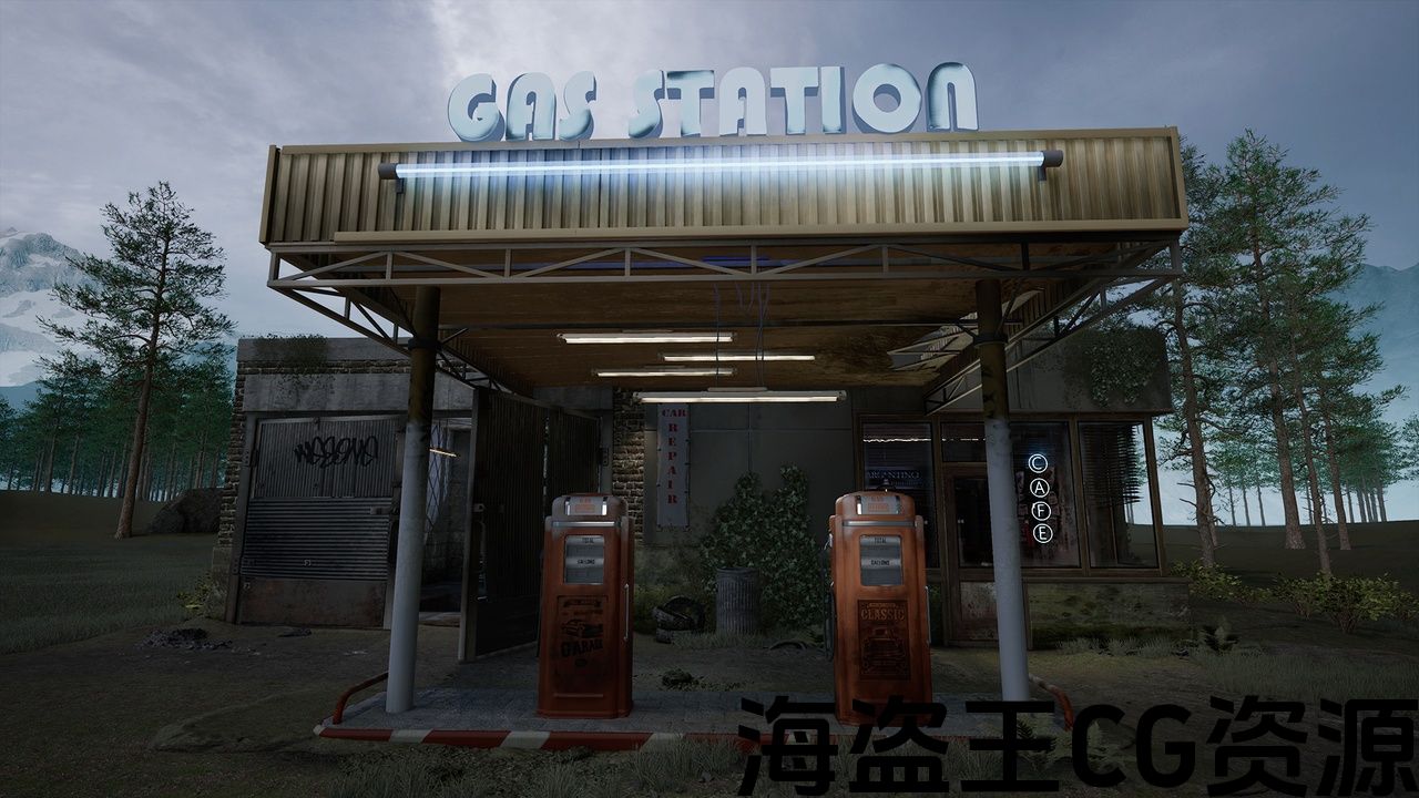 高品质的加油站,咖啡馆和车库环境充满道具