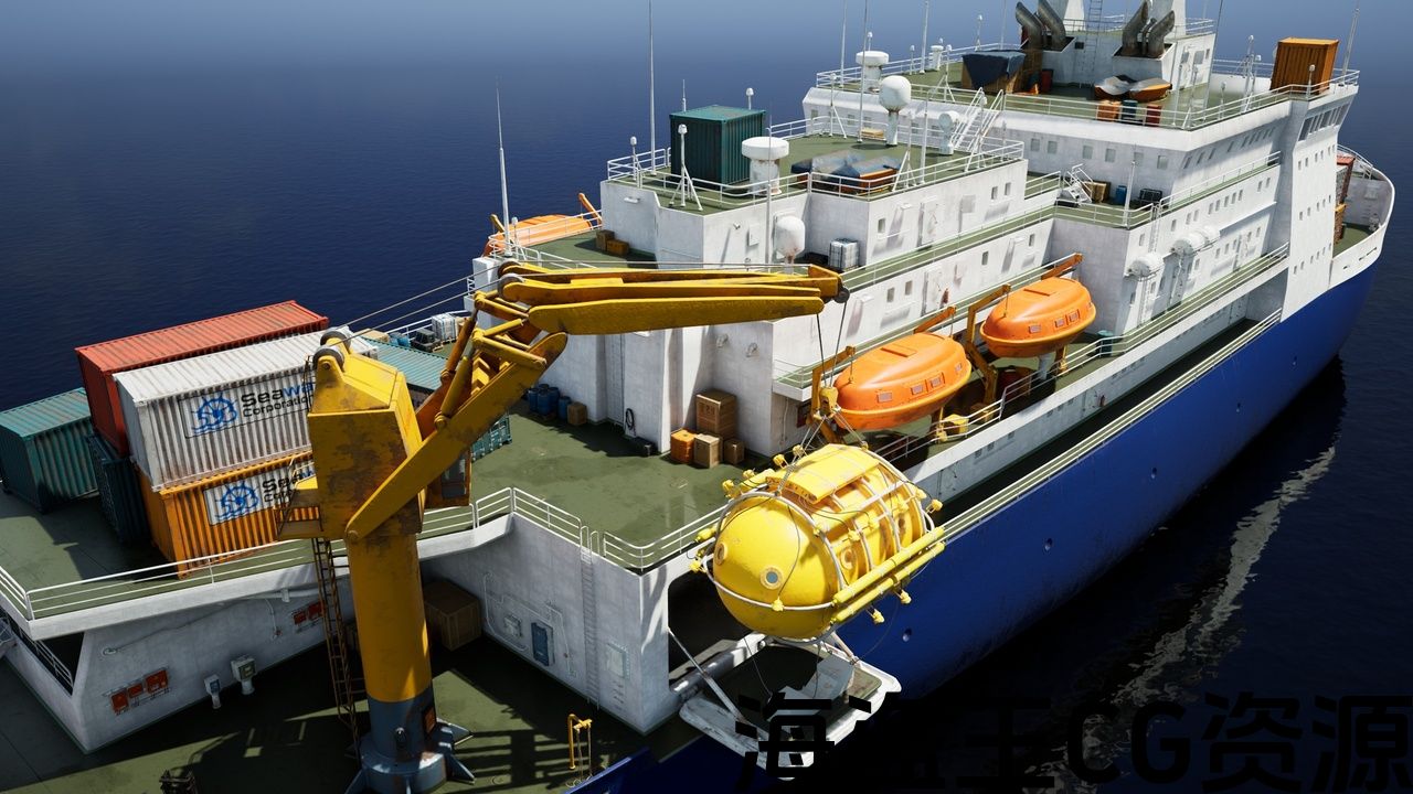 这个包包含122米长的船只,设备和资产,包括潜水舱,货物集装箱,机库,大型起重机,过渡室和各种道具